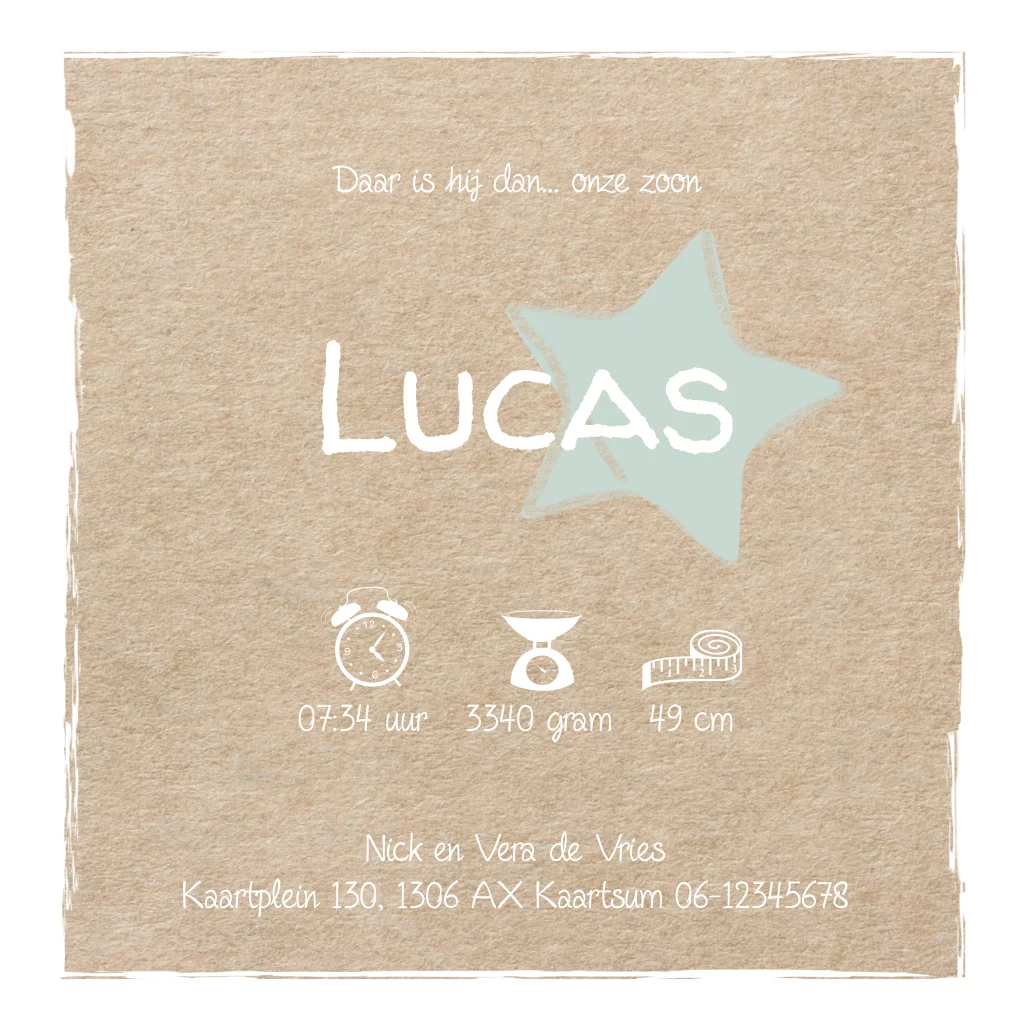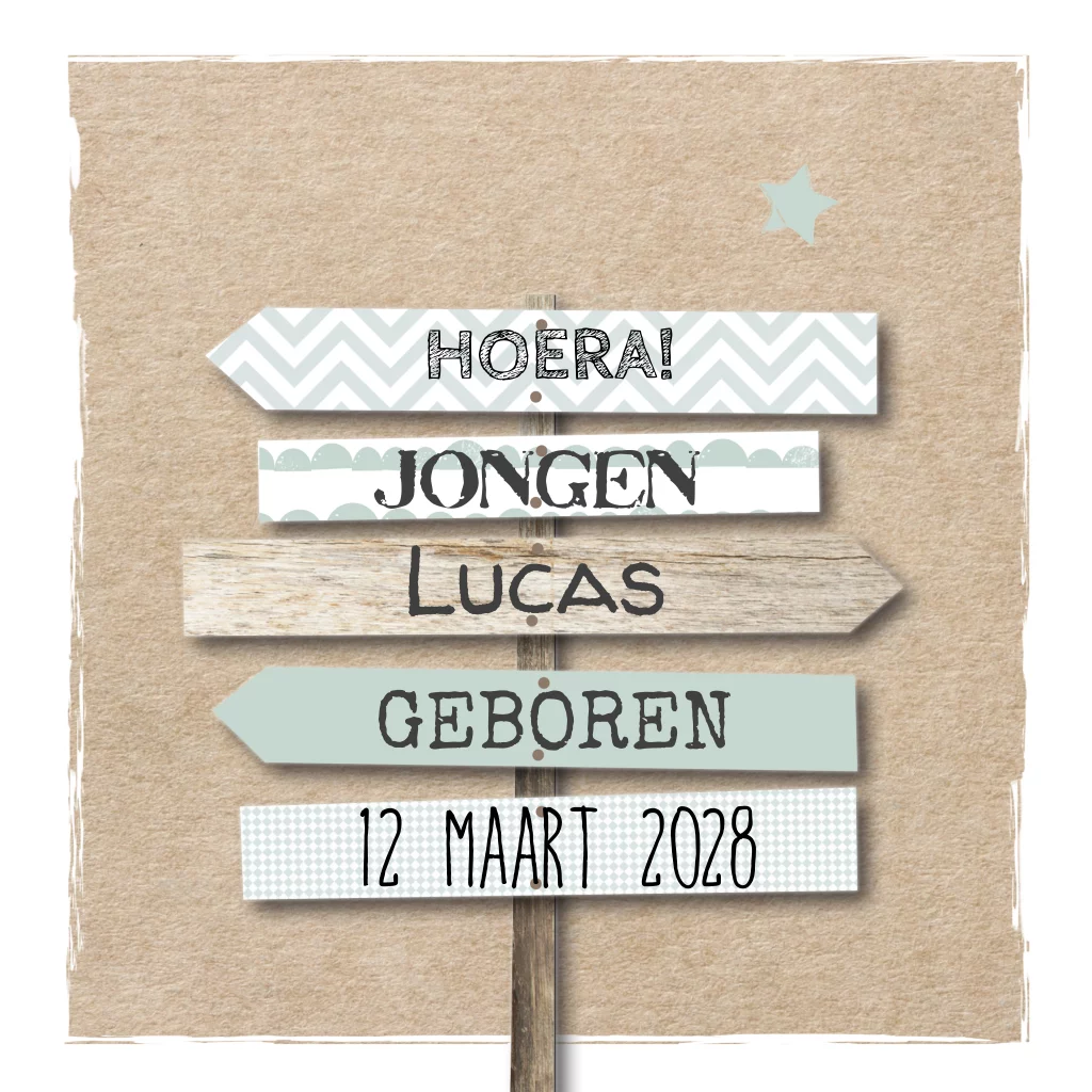 Kraft look geboortekaartje jongen met wegwijzer borden.