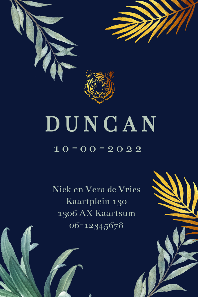 Jungle staand geboortekaartje met bladeren en tijger. (3353)