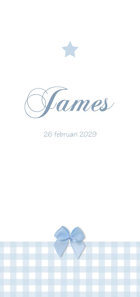 Een leuk klassiek geboortekaartje voor een jongen in een trendy langwerpig formaat. Met lieve ruitjes en een hippe echte strikje!