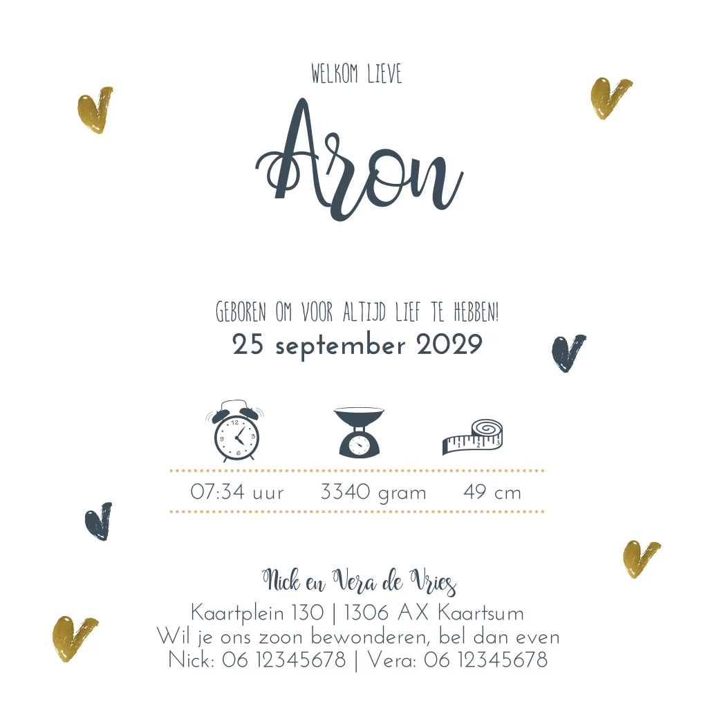 Geboortekaartje lief voor een jongetje met een echt houten hartje op een donker blauwe achtergrond. LET OP: Het houten vormpje op dit kaartje wordt niet mee gedrukt, deze is ter voorbeeld. Op die plek kun je straks zelf het Γ©chte houten vormpje plakken. Bij je proefdruk kun je een voorbeeldsetje met alle houten vormpjes bestellen.