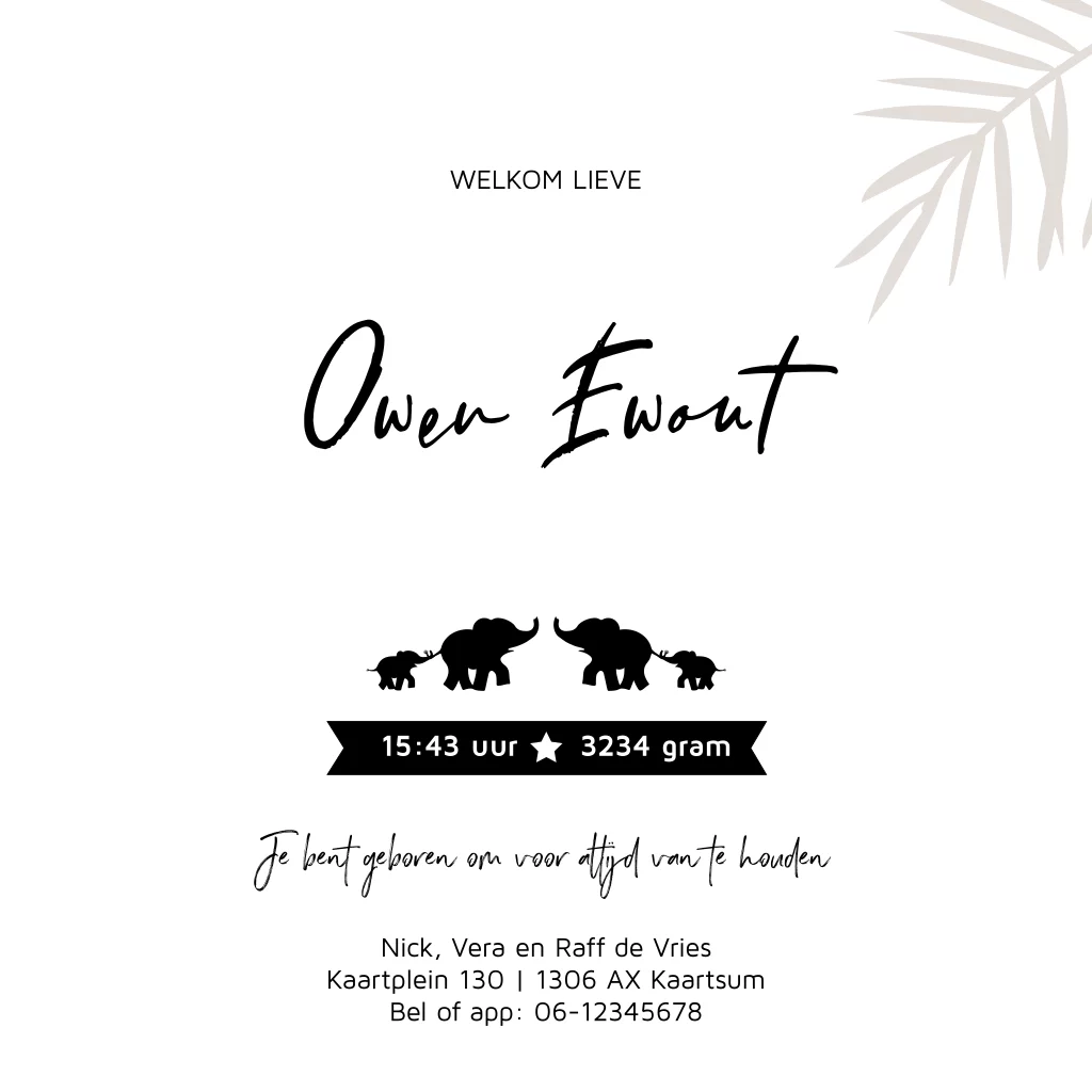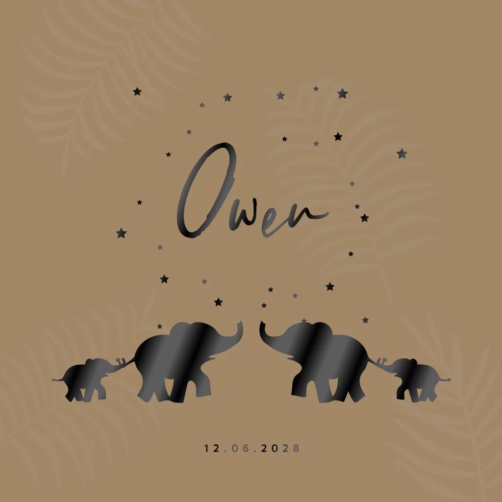 Lief geboortekaartje jongen een broertje met zwart folie en olifanten.