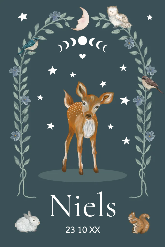 Een prachtige geboortekaart met waterverf illustraties van verschillende schattige bosdieren. Je ziet hier een lief hertje onder takjes met vogeltjes een uiltje, de maan en een sterrenhemel gedrukt met echt luxe goudfolie. Deze kaart kun je naar eigen wens bewerken door bijvoorbeeld de kleuren aan te passen.