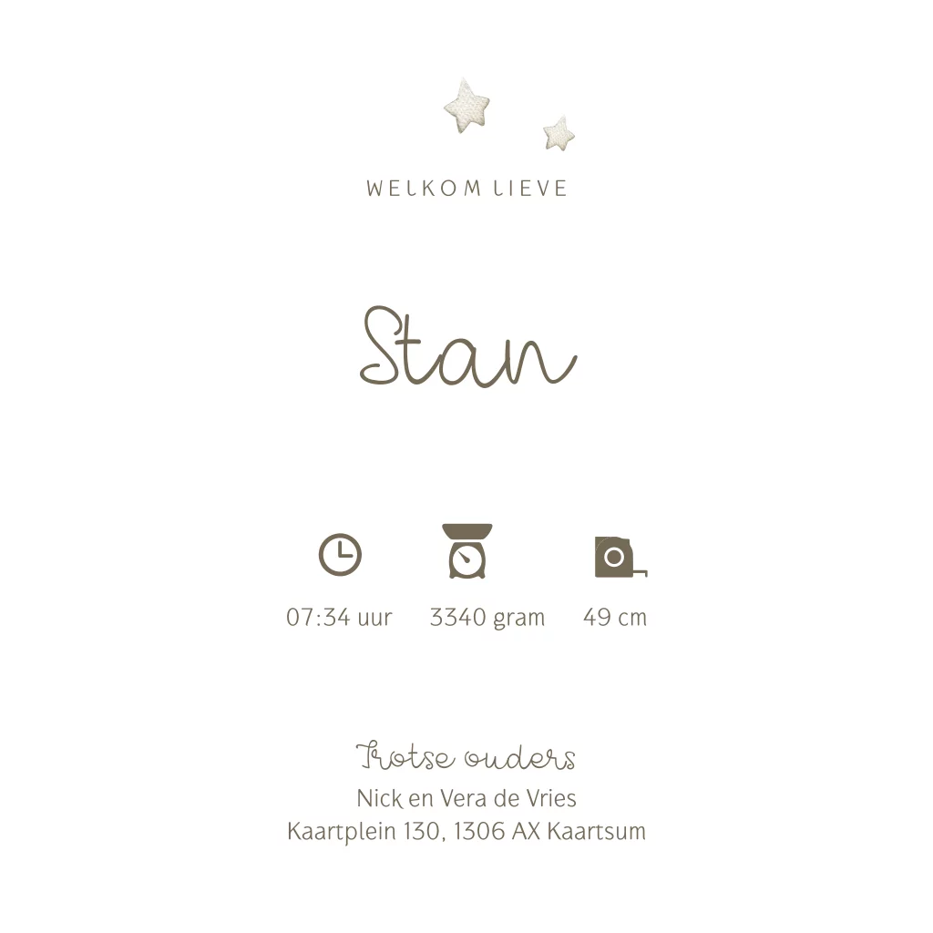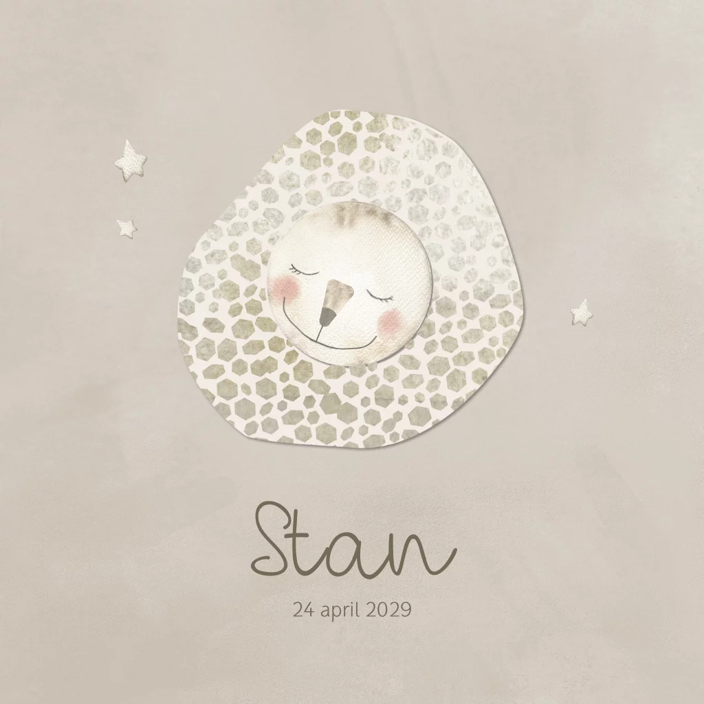 Geboortekaartje voor een jongetje in zand beige kleur met de kop van een lieve leeuw.