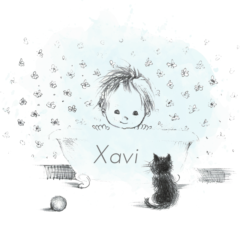 Pentekening geboortekaartje voor een jongen in badkuip op een licht groene achtergrond. (3873)