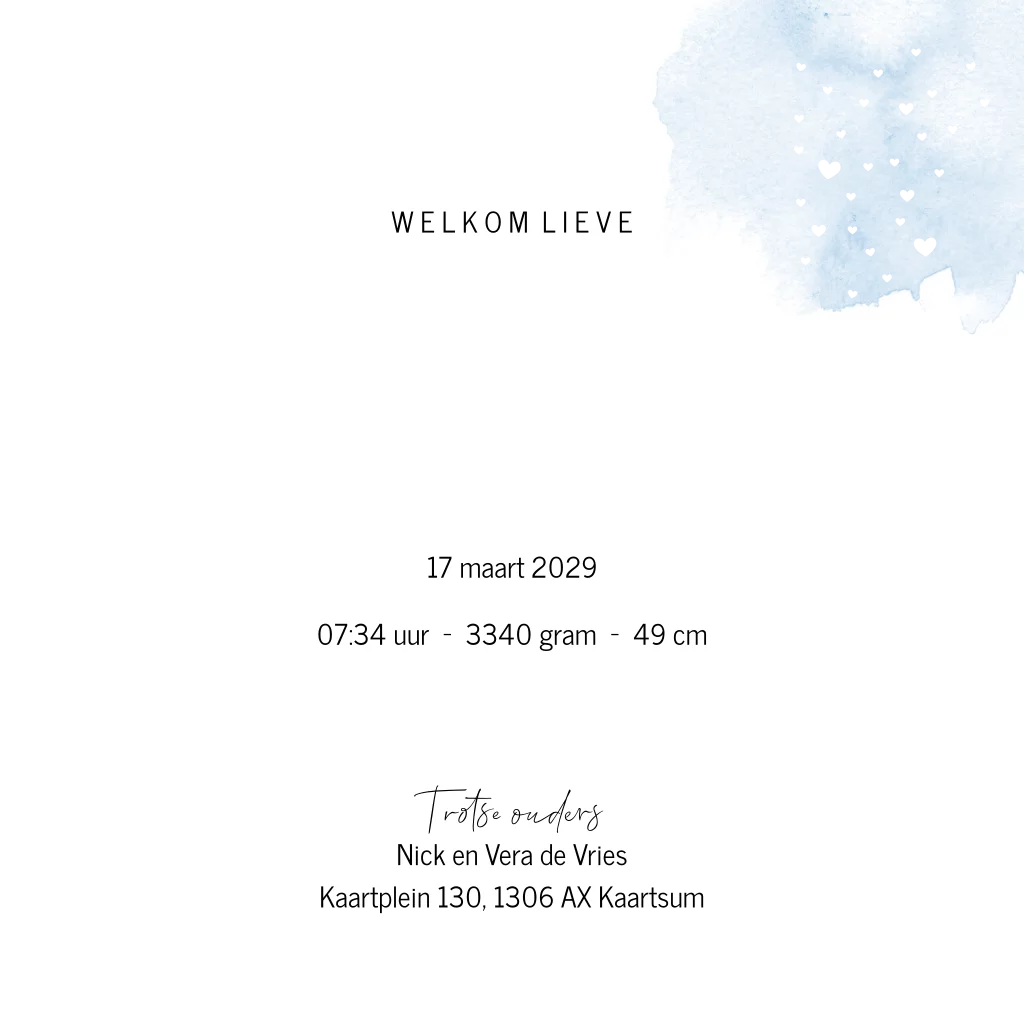 Geboortekaartje lief voor een jongetje met blauwe watercolor en rond kader in foliedruk.