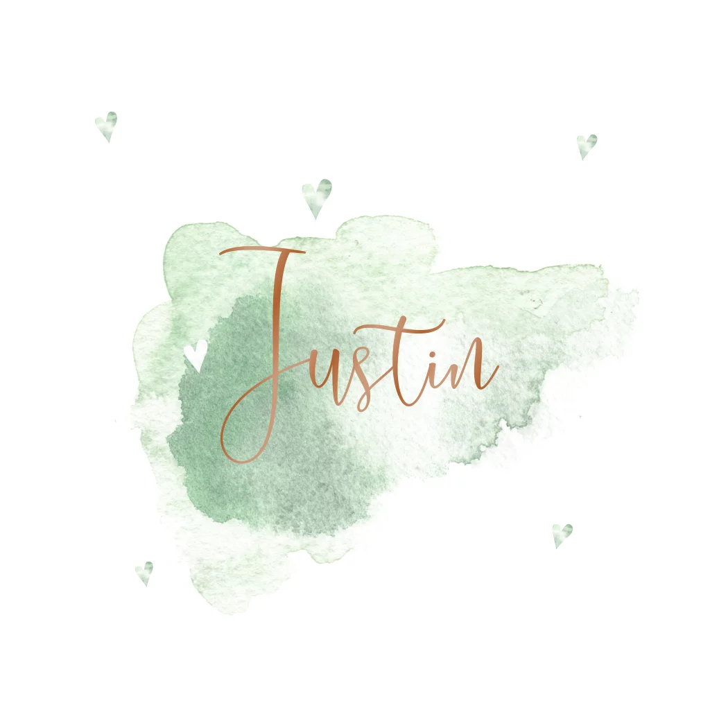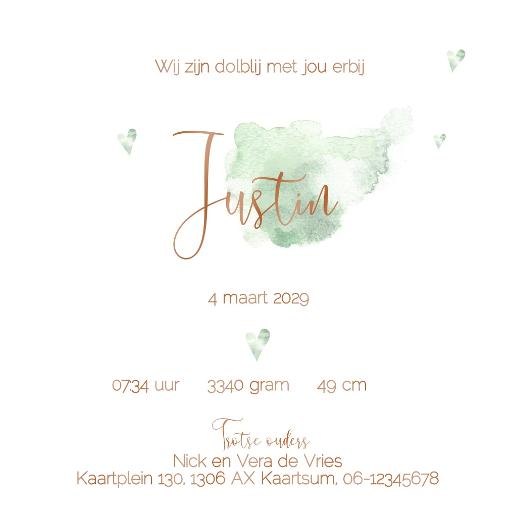 Geboortekaartje voor een jongen met groene aquarel en hoogglans koper lak.