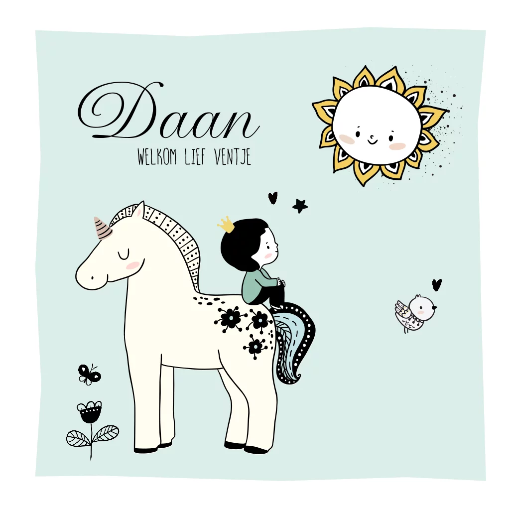 Lief babykaartje voor een jongetje met illustratie van een eenhoorn en zonnetje.