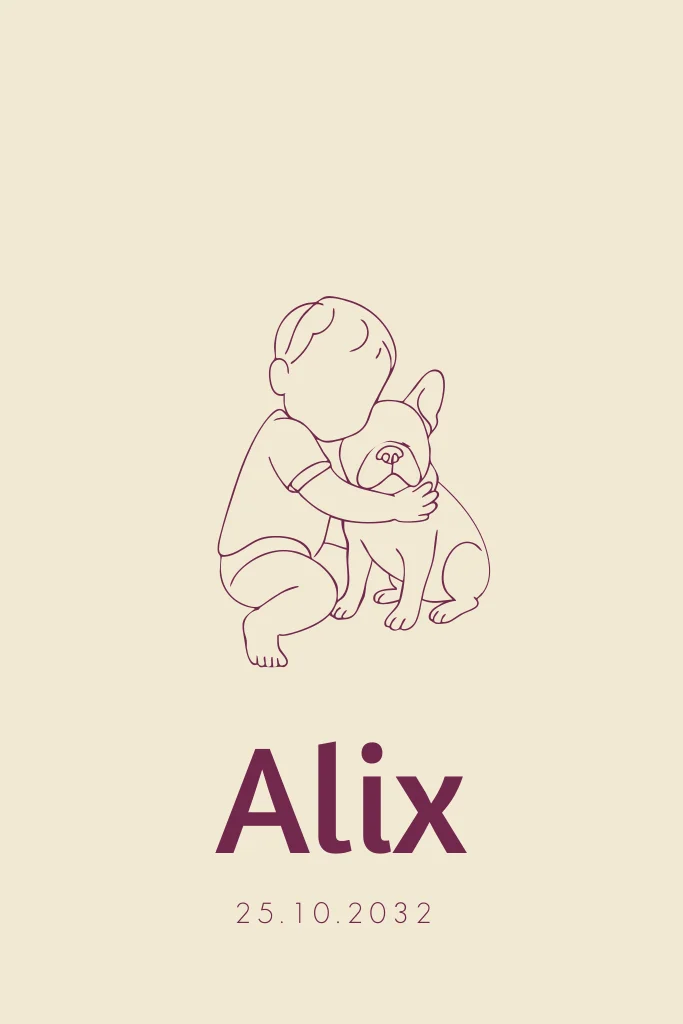 Schattig geboortekaartje met een lijntekening van een jongen die zijn hond knuffelt. Pas het ontwerp persoonlijk aan in onze online editor.