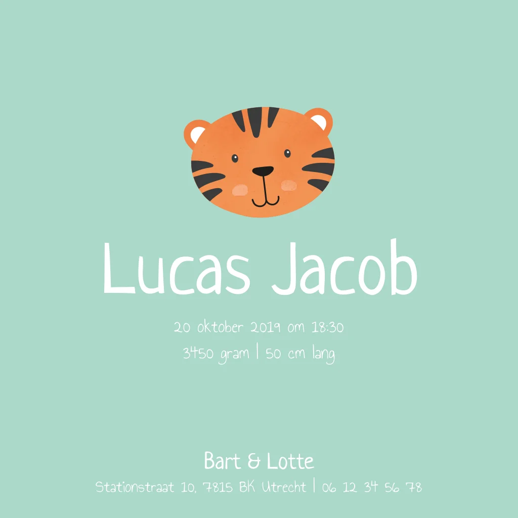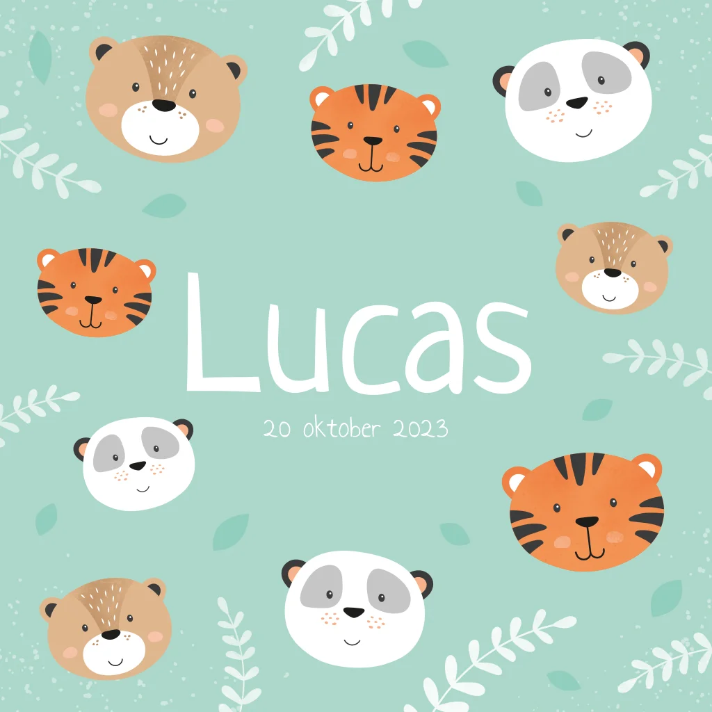 Vierkant gevouwen geboortekaartje voor een jongen of meisje in de kleur mint. Met verschillende dieren op de voorkant, tijger, beer en panda. Met daar omheen takjes en bladeren. Aan de binnenkant staat 1 van de dieren groot, deze kan je zelf kiezen.(3066)
