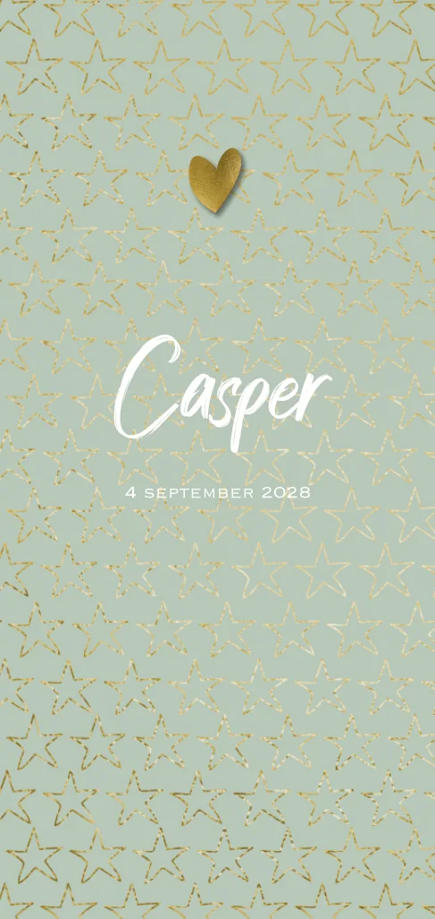 Geboortekaartje voor een jongetje met sterretjes patroon en goud look hartje.