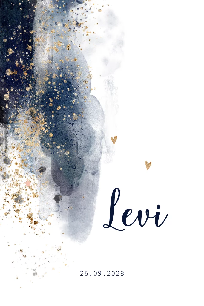 Modern geboortekaartje voor een jongetje met blauwe waterverf en goud kleurige glitters.