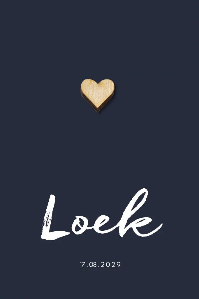 Geboortekaartje voor een jongetje met blauwe achtergrond en echt houten hart. LET OP: Het houten vormpje op dit kaartje wordt niet mee gedrukt, deze is ter voorbeeld. Op die plek kun je straks zelf het Γ©chte houten vormpje plakken. Bij je proefdruk kun je een voorbeeldsetje met alle houten vormpjes bestellen.
