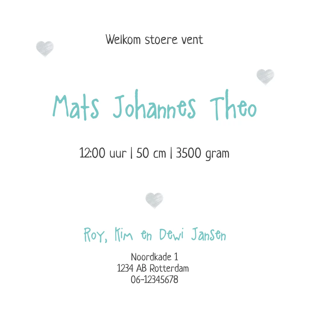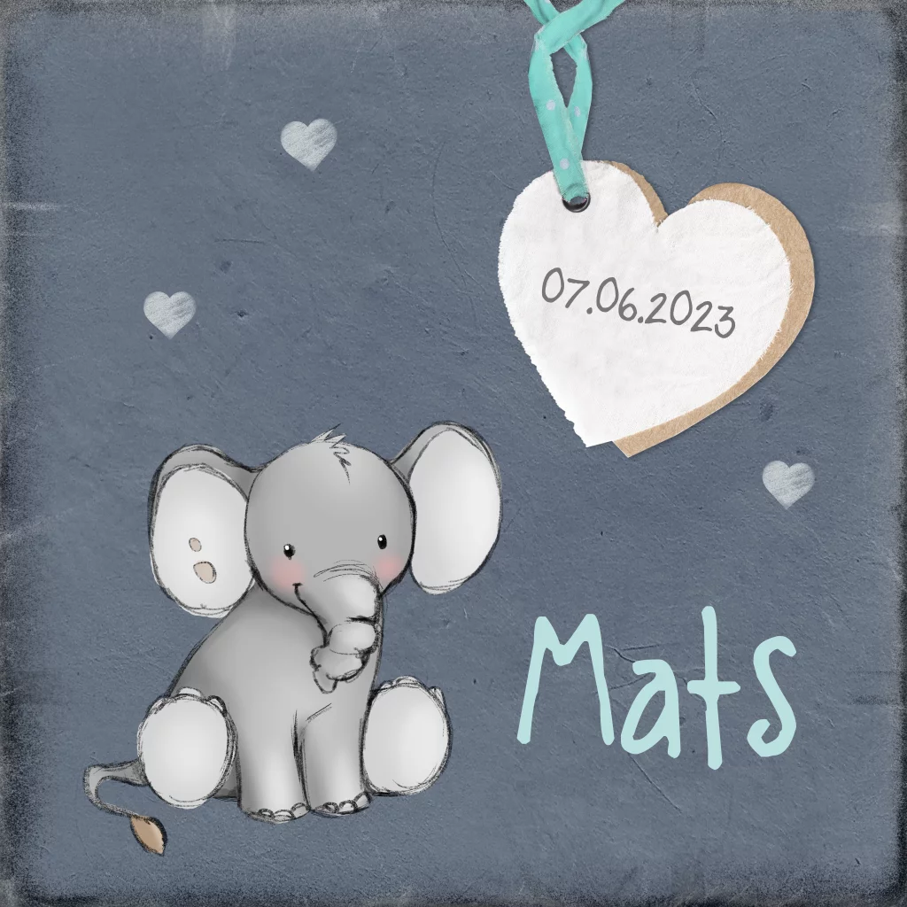 Illustratief geboortekaartje voor een jongen met olifantje en hartjes op mooie blauwe achtergrond. De geboortedatum kun je in het hartje plaatsen. Pas het kaartje helemaal naar jouw smaak aan in de editor.