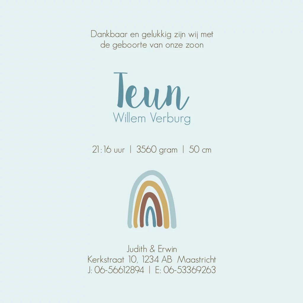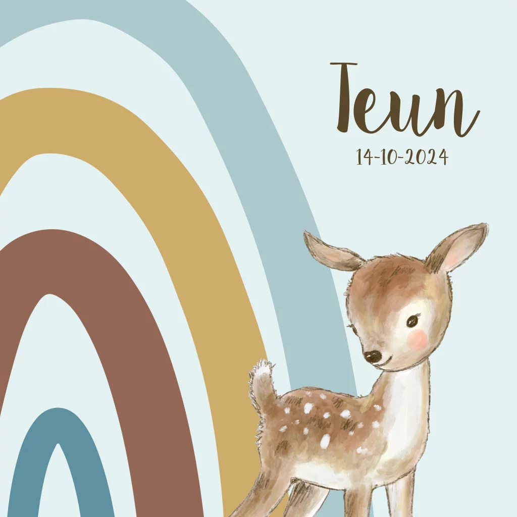 Lief geboortekaartje voor een jongen met regenboog en hertje op blauwe achtergrond. (3868)