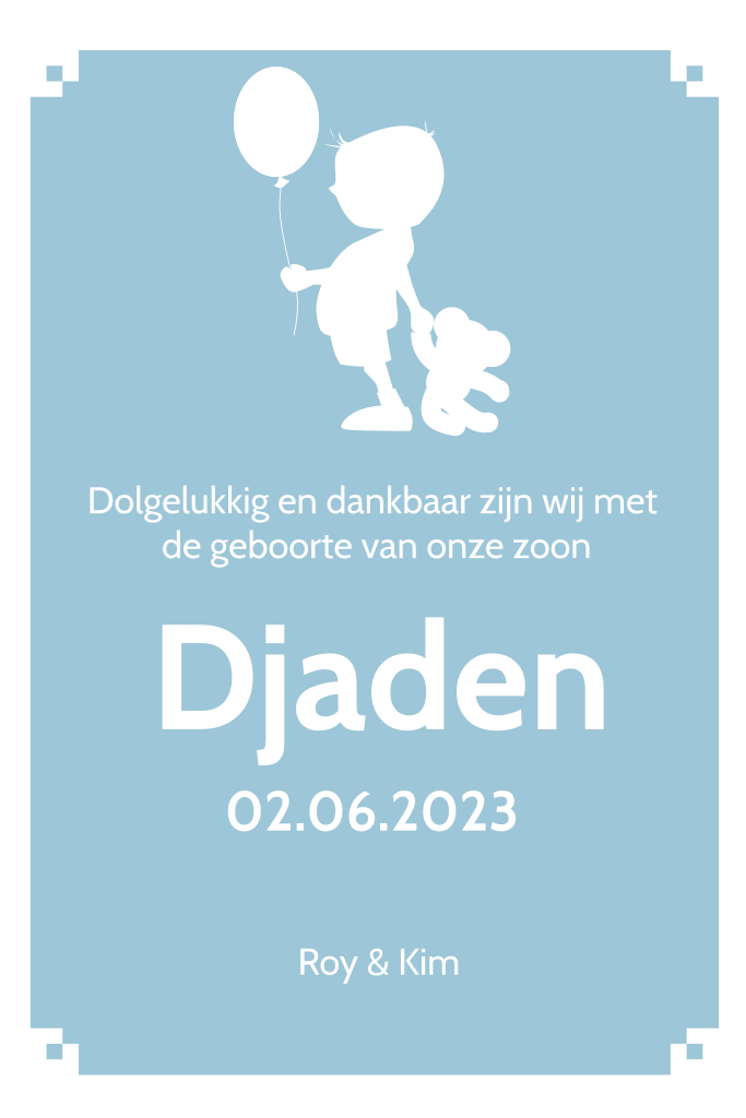 Het jongetje met zijn ballonnetje en teddybeer staat lief op dit simpele geboortekaartje. Pas de kleur van het kaartje zelf aan. (999999)