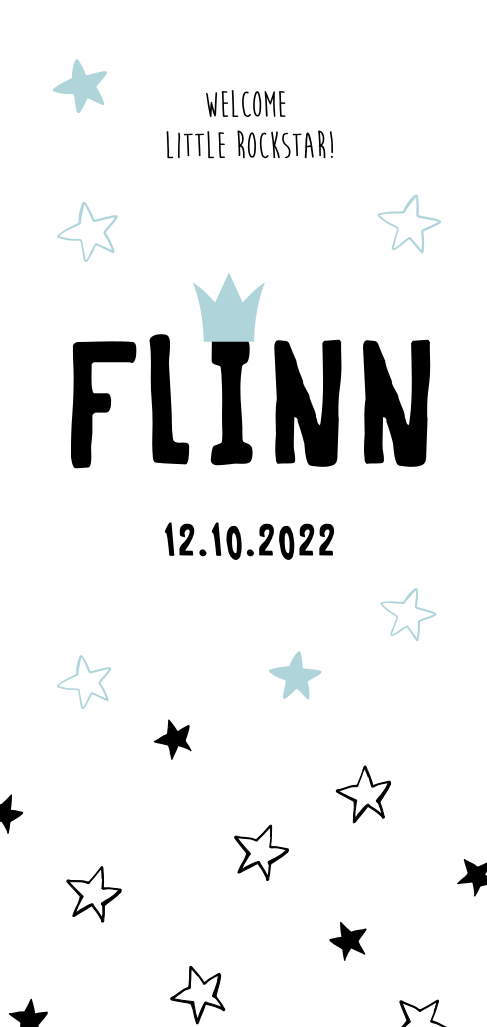 Vrolijk geboortekaartje voor een jongen met blauwe, witte en zwarte sterretjes. De naam van je kindje staat centraal en de tekst 'welcome little rockstar' kan je zelf aanpassen.