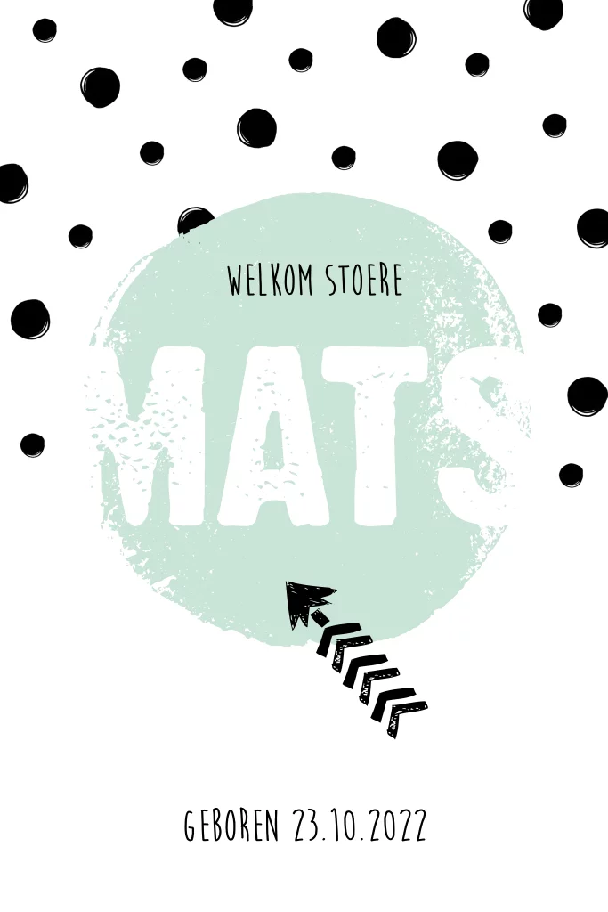 Vrolijk jongens geboortekaartje met frisse stippen en mint