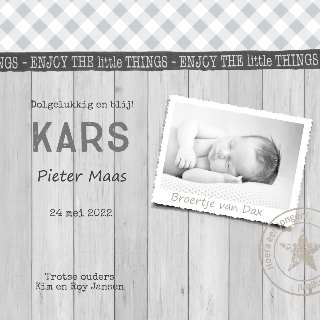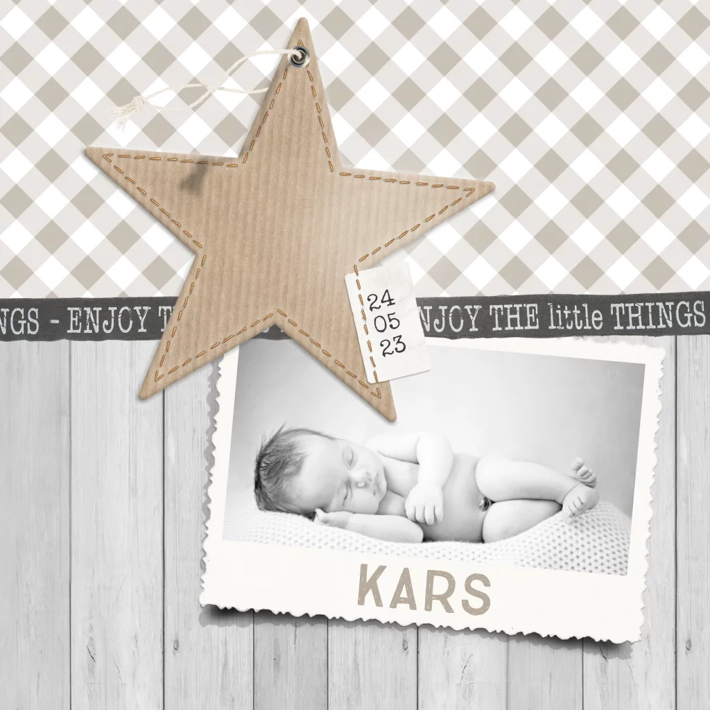Hou je van stoer en moderne grijstinten? Kies dan voor dit stoere geboortekaartje zoon met houtlook, ster, foto en ruitjes. Maak de kaart uniek door deze naar eigen wens te bewerken in de editor. (3280)