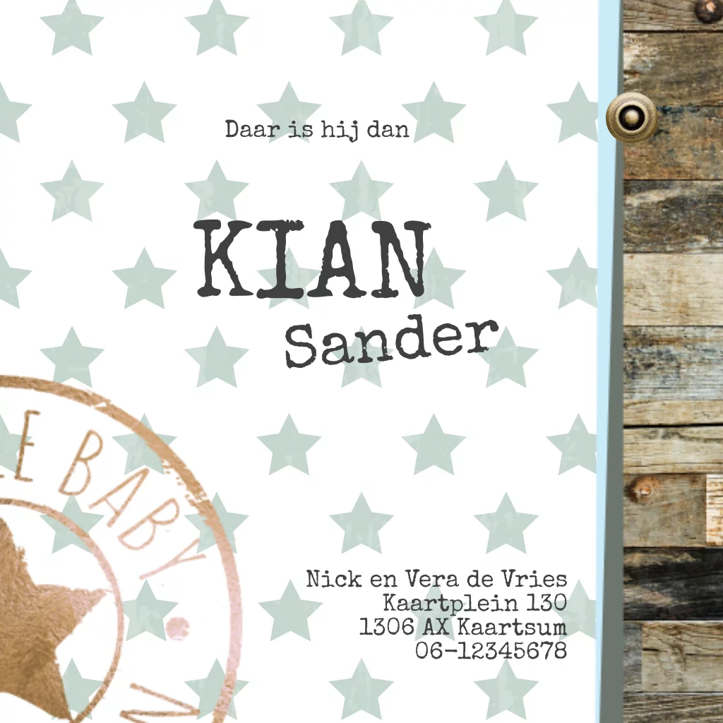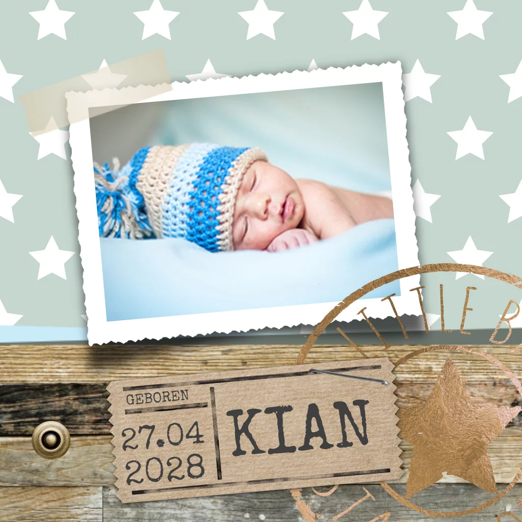 Stoer geboortekaartje voor een jongetje met hout look patroon en sterren. Er is ruimte voor een eigen foto.