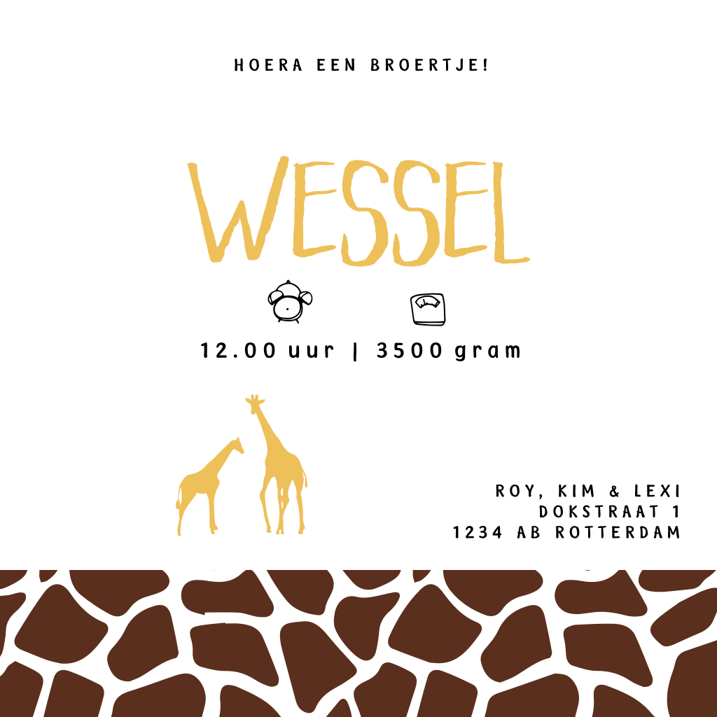 Dol op prints en dieren uit de jungle? Kies dan voor dit stoere geboortekaartje zoon giraf. Mooi te combineren met een zandkleurige envelop. (3278)
