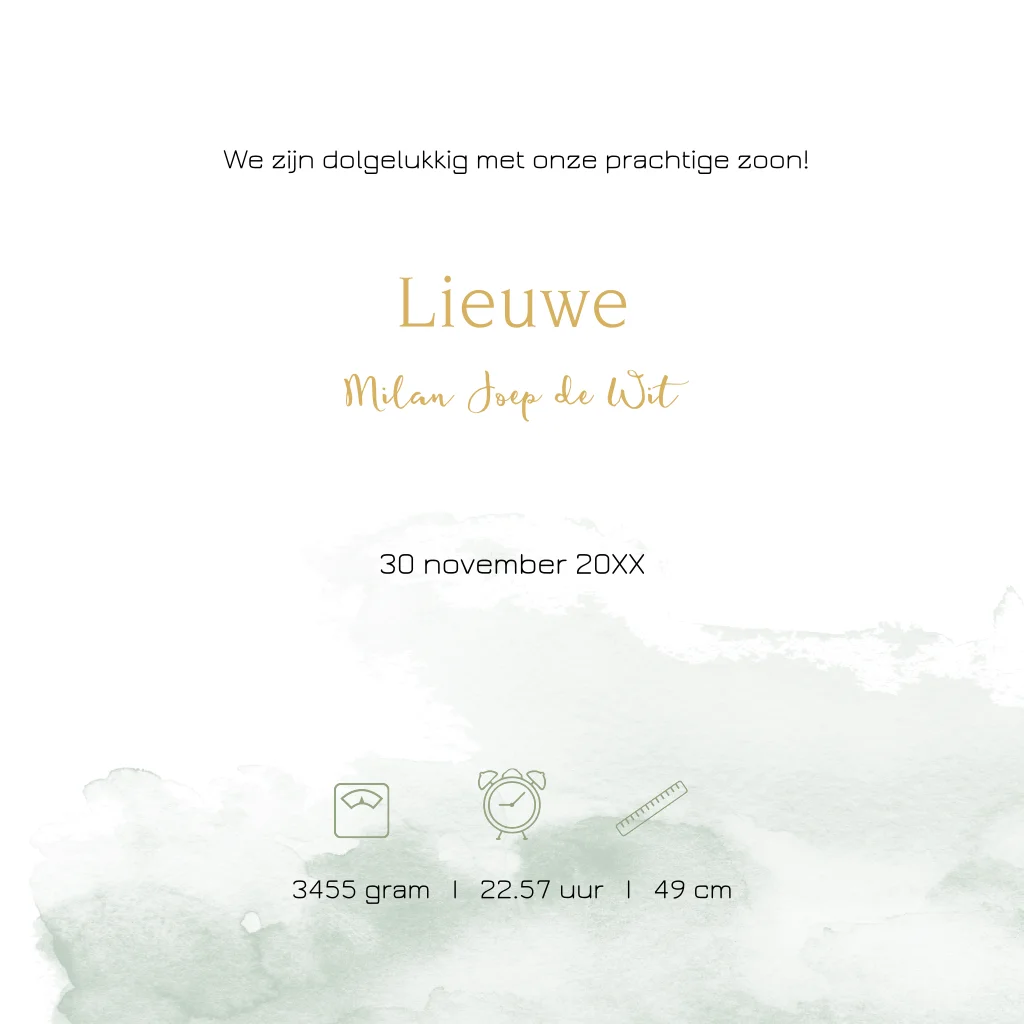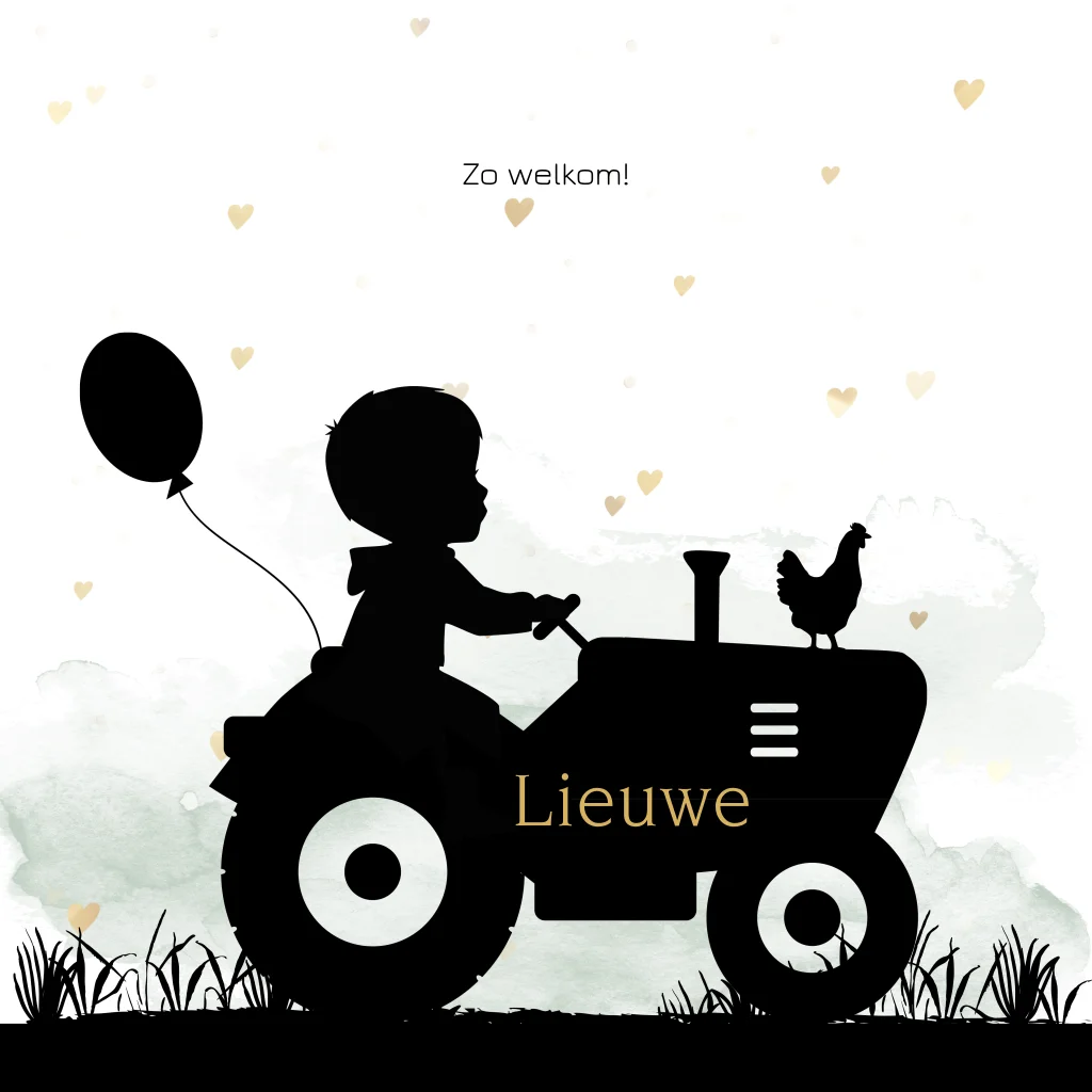Een leuk geboortekaartje voor een zoontje met een silhouet van een jongetje op een tractor met een kip en een watercolour achtergrond. Op de achterzijde silhouet van een jongetje op de rug van een koe. Deze kaart kun je eenvoudig zelf bewerken door de kleuren en teksten aan te passen.