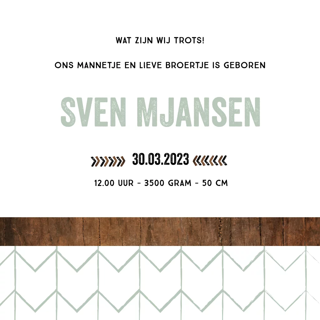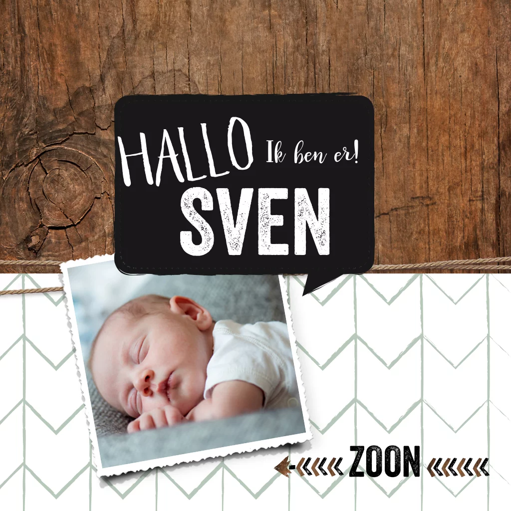 Stoer geboortekaartje zoon met foto en houtlook