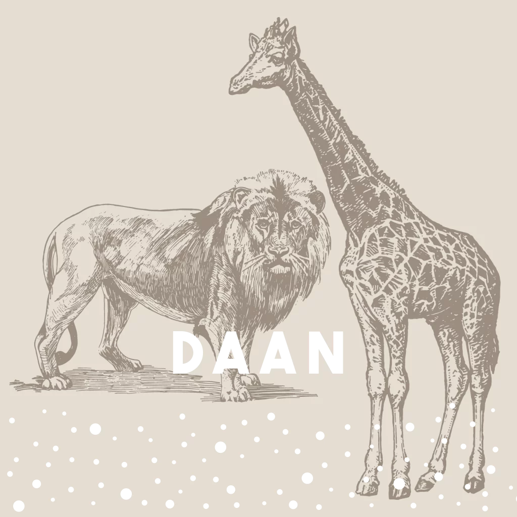 Stoer geboortekaartje voor een jongen met leeuw, giraffe en foliedruk.