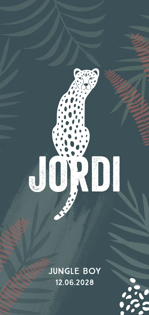 Stoer babykaartje voor een jongen. Jungle met luipaard.