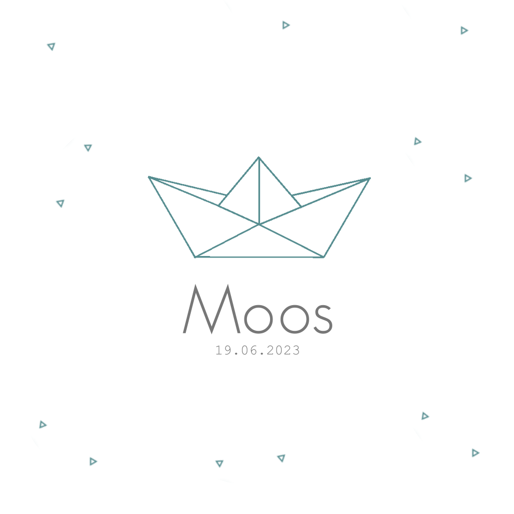 Hip en geometrisch geboortekaartje met origami bootje en driehoekjes in trend kleur. (3706)
