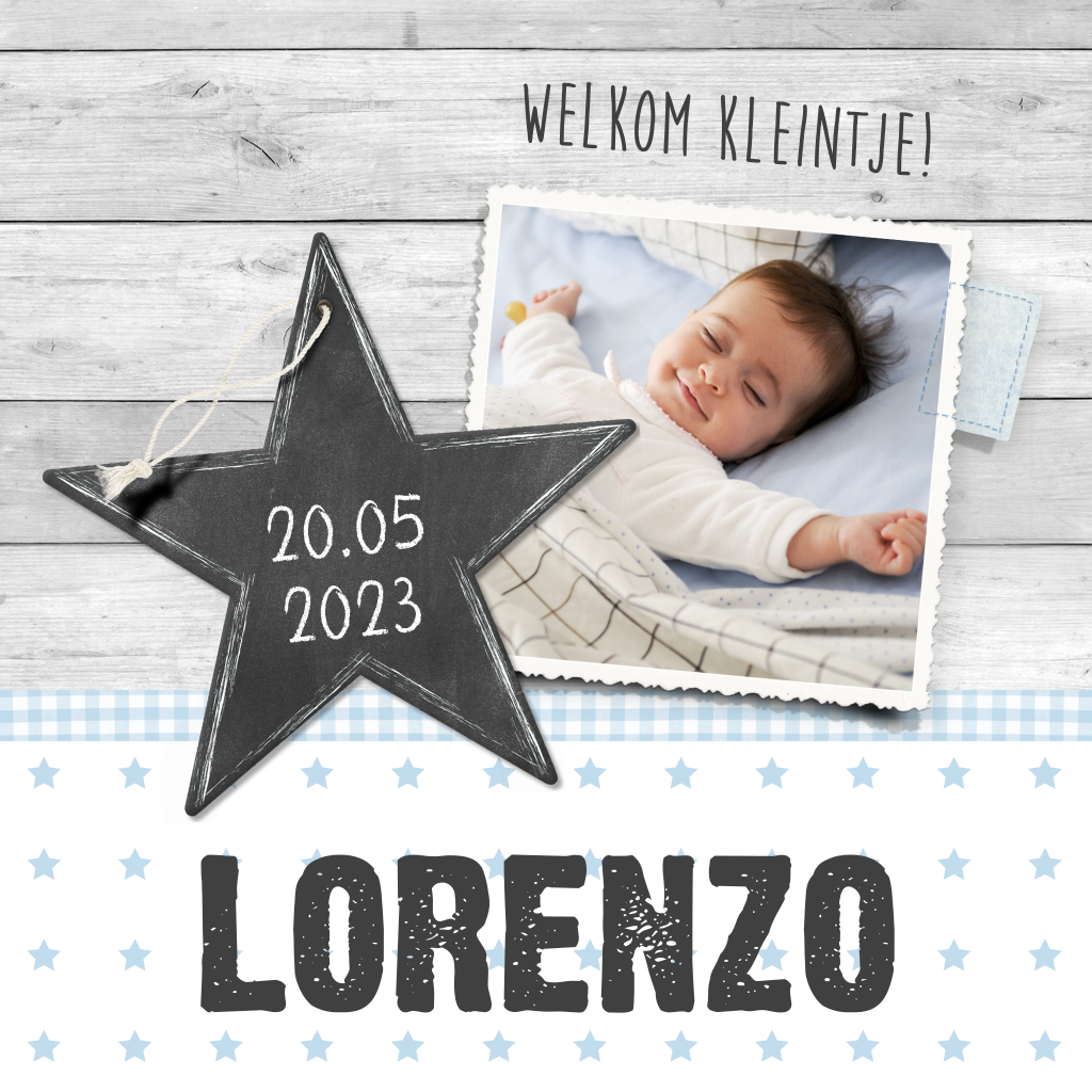 Stoer geboortekaartje voor een jongen met fotokader, sterren en hout.