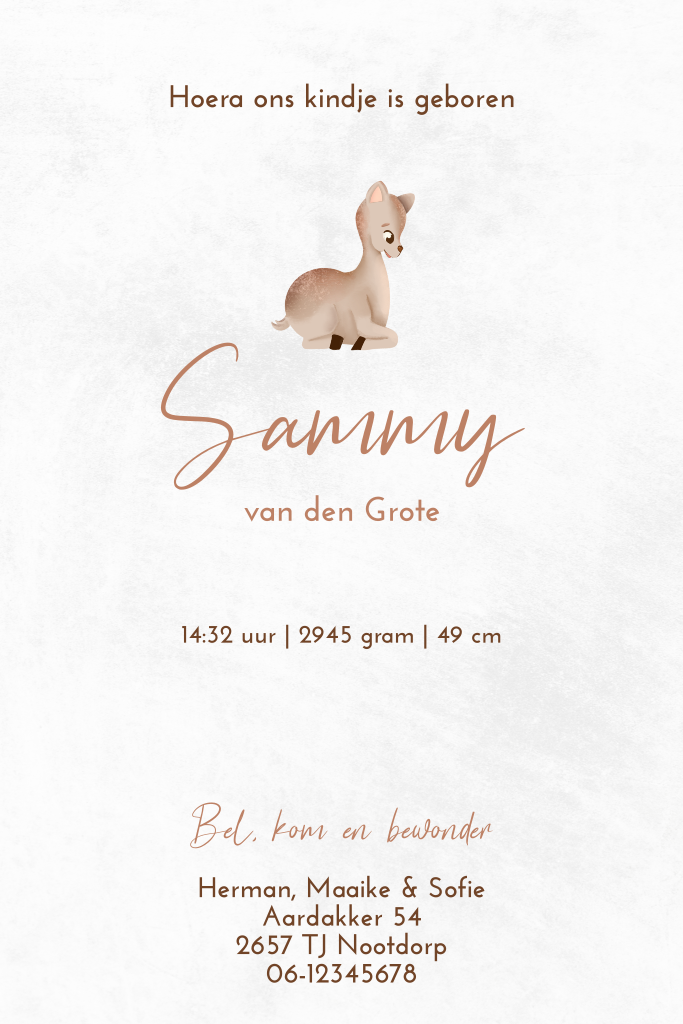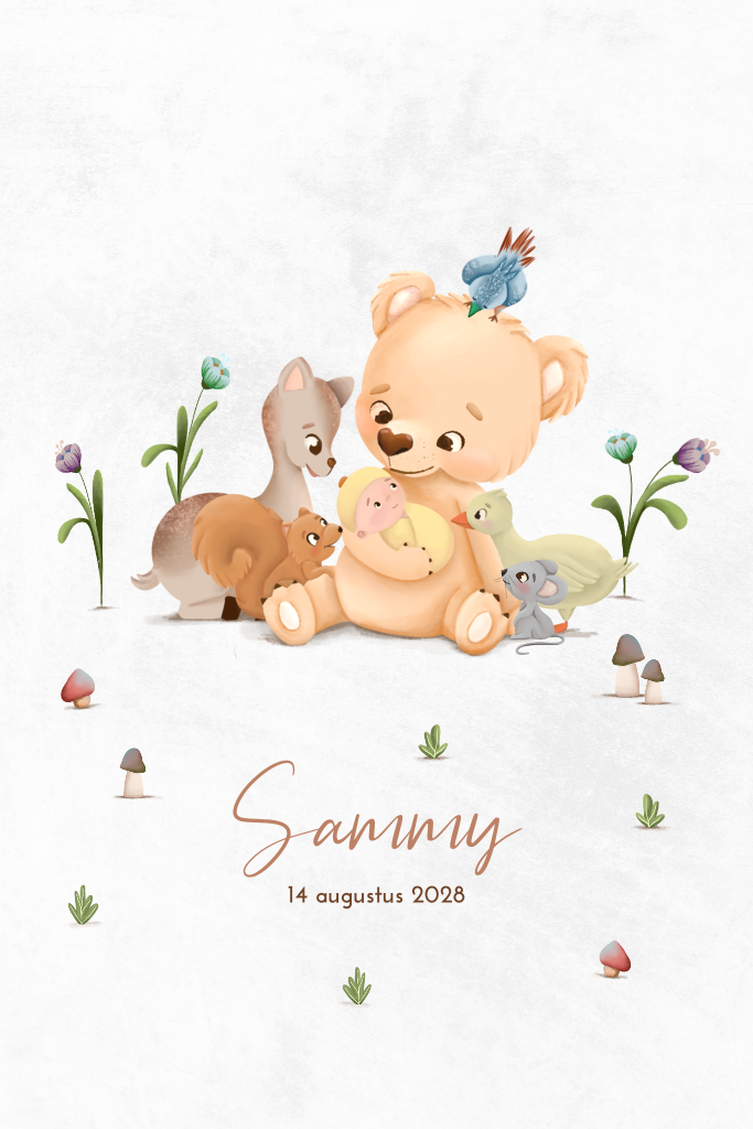 Lief unisex geboortekaartje met getekende bosdieren. Beertje, hert en eekhoorn. (4526)