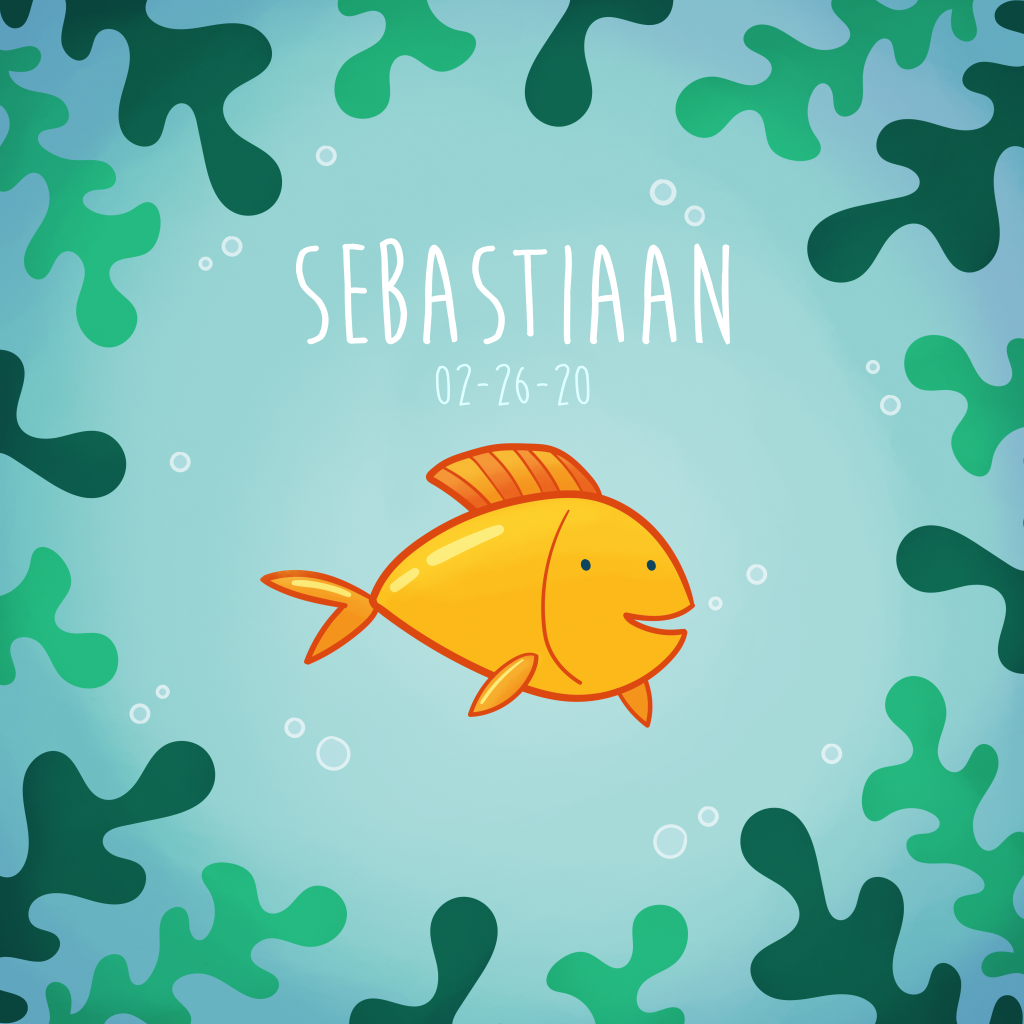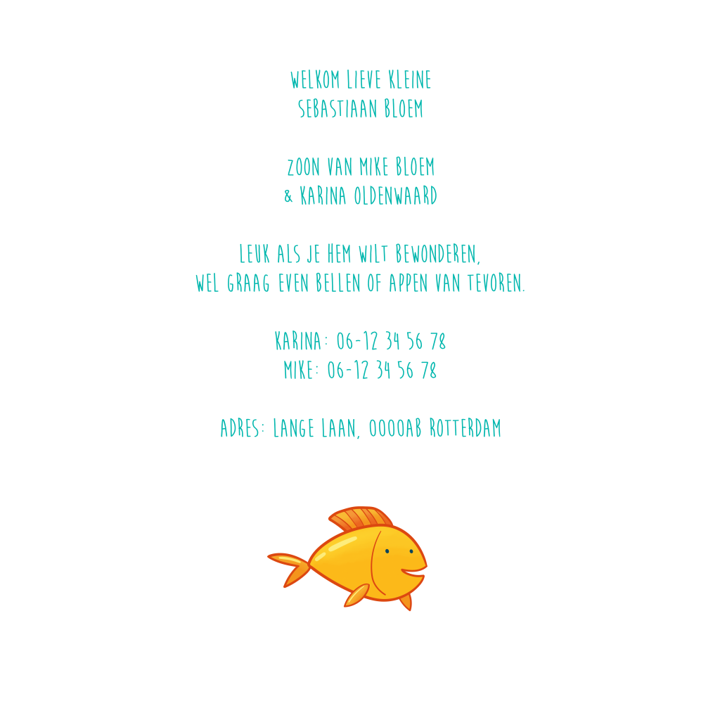 Vrolijk baby visje geboortekaart jongen oranje zee. (4113)