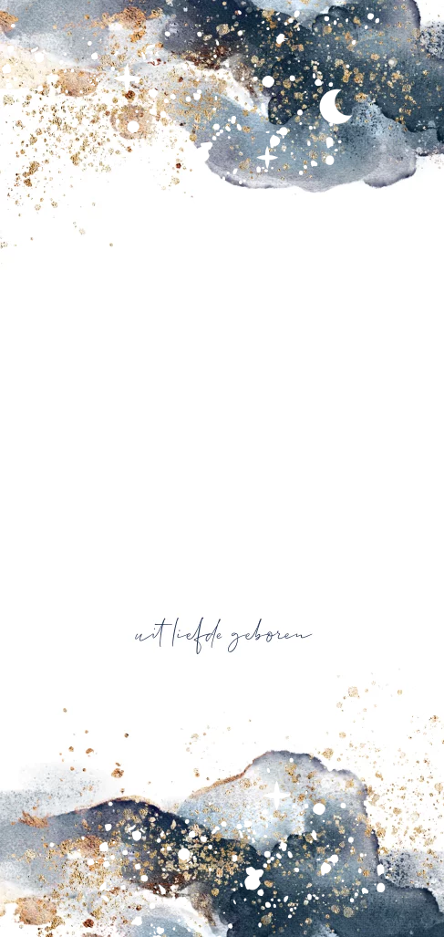 Aquarel geboortekaartje voor een jongetje met blauwe watercolor en foliedruk maan en sterren.