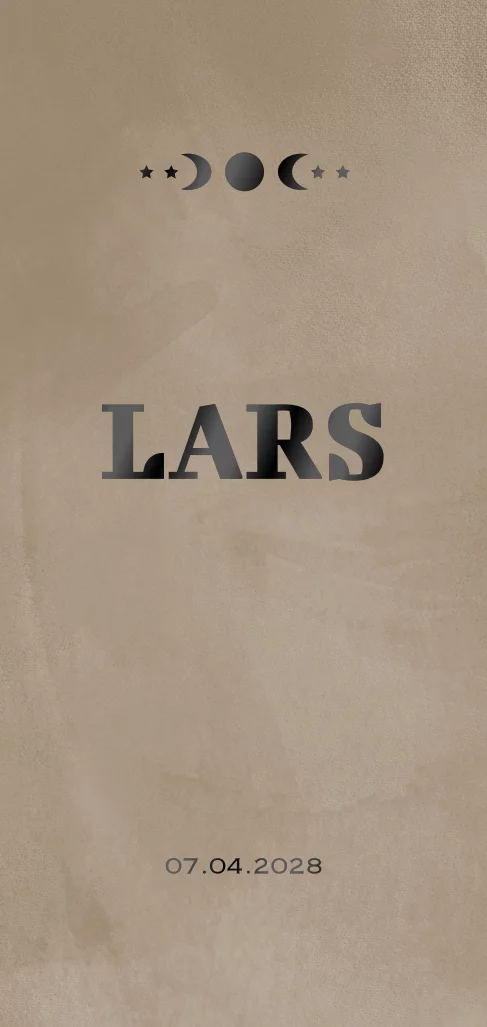 Stoer geboortekaartje jongen met zandkleurige achtergrond kleur. Maan en sterren in foliedruk. (4342)