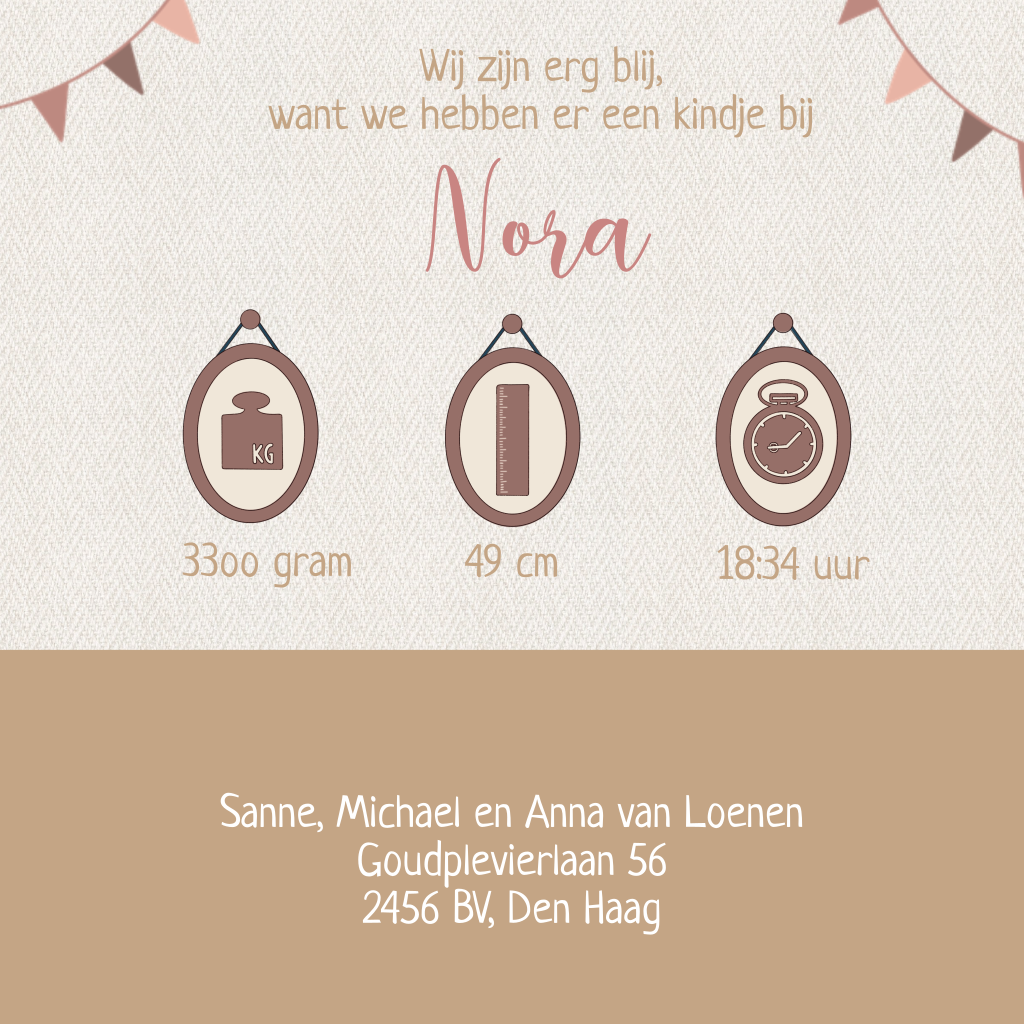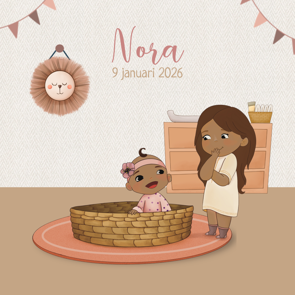 Getekend geboortekaartje kinderkamer en baby in mandje met een grote zus. (4312)