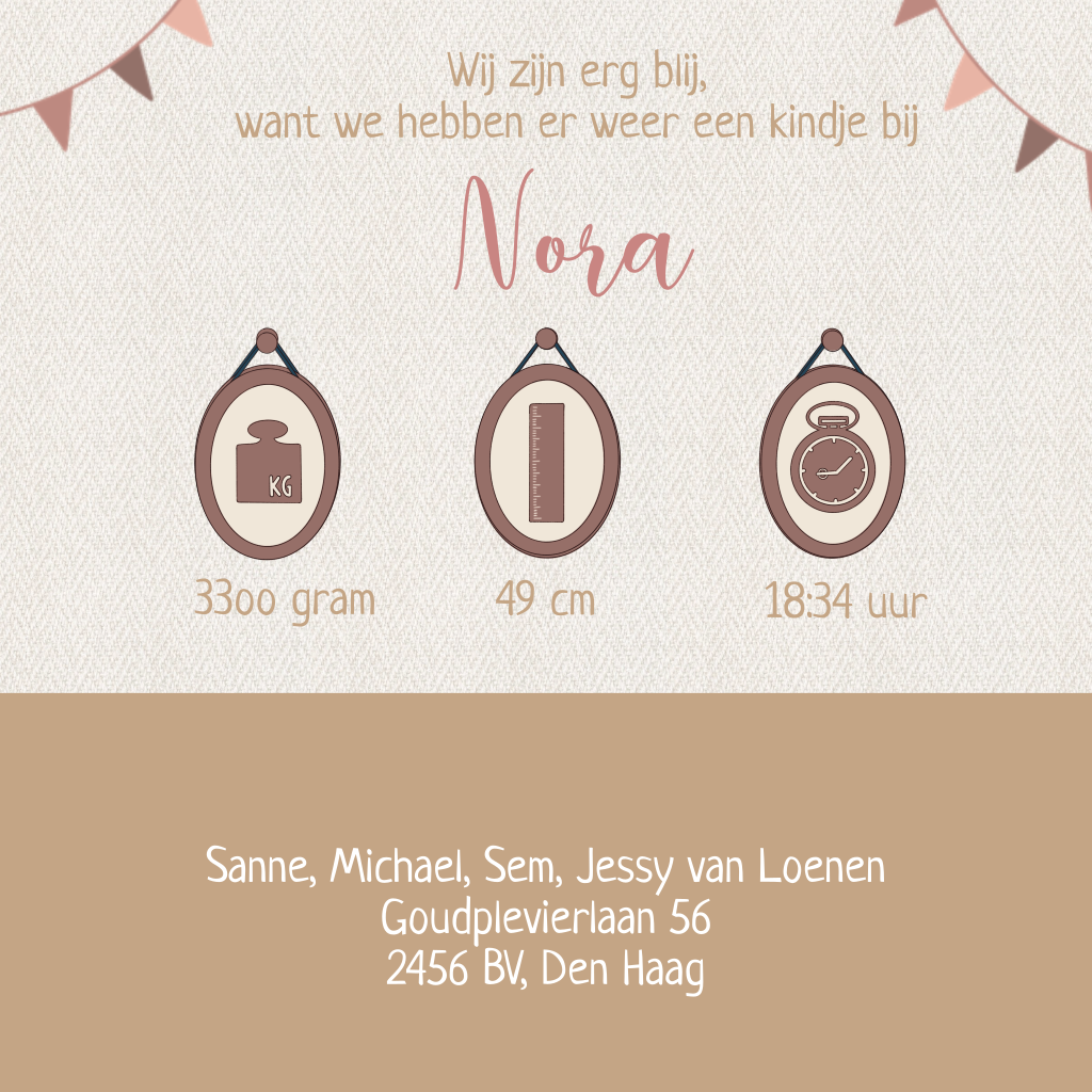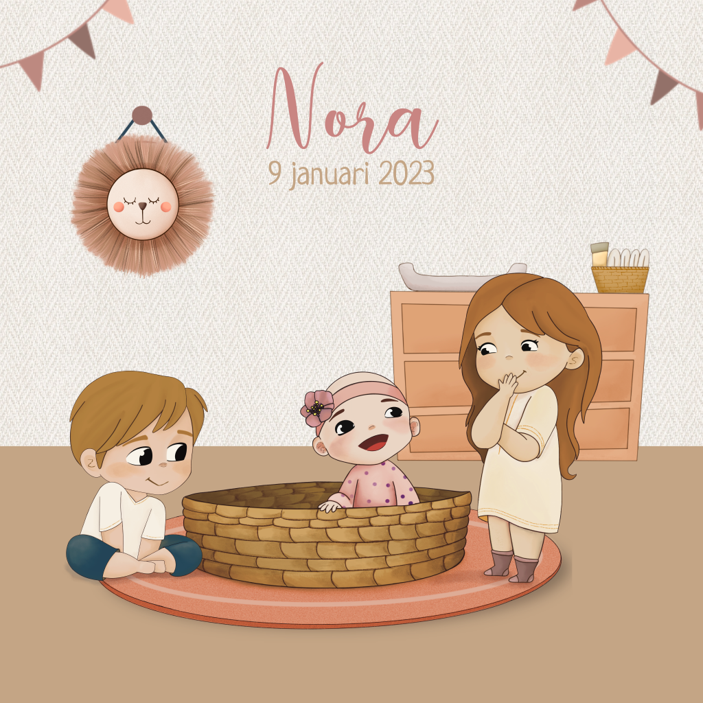 Getekend geboortekaartje meisje in mand. Leuke kinderkamer met details en jongere broer en grote zus. (4319)