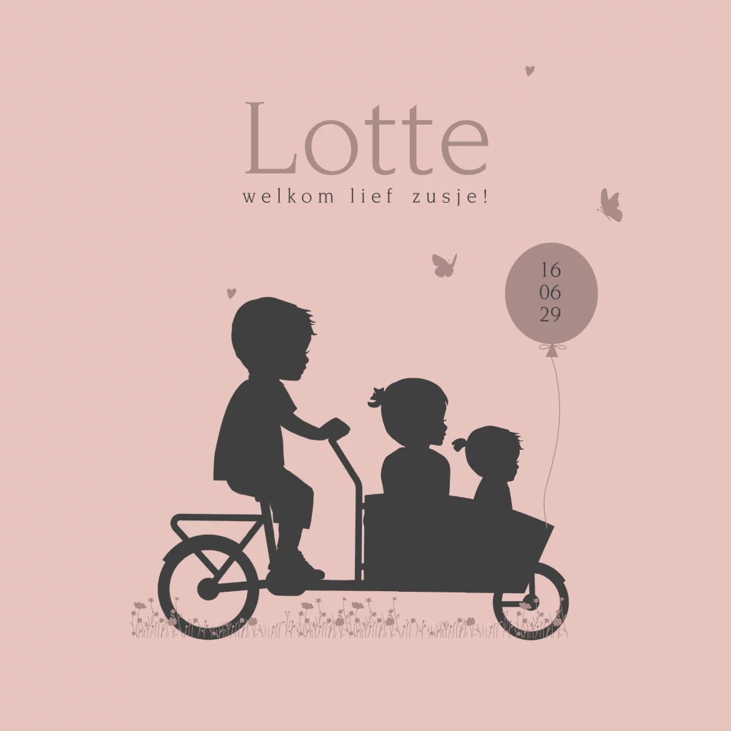 Hip geboortekaartje voor een 3e kindje meisje hip. Baby broertje zit in een loopkar en de grote broer loopt erachter. De kleuren zijn naar wens aan te passen. Ook beschikbaar voor een meisje en met een grote zus. (4775)