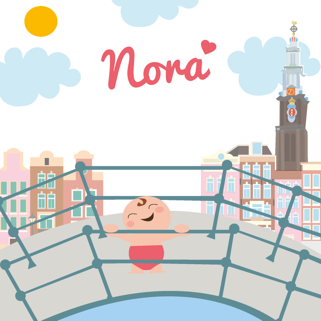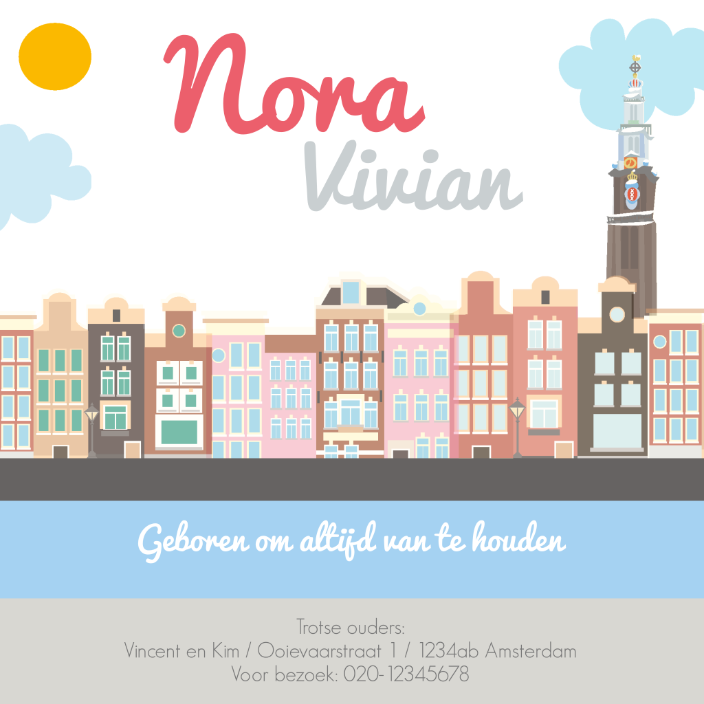 Vrolijk geboortekaartje voor Amsterdams kindje. Met getekende baby, grachten, grachtenpandjes en de Westerkerk. (3189)