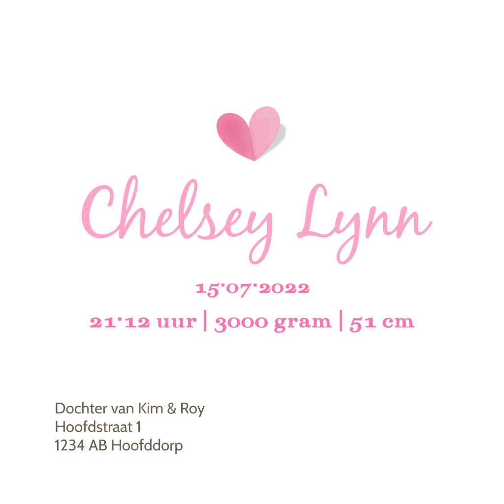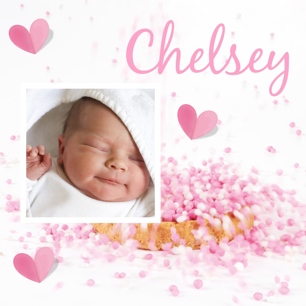Dit unieke geboortekaartje laat beschuit met muisjes zien. Heel veel muisjes...! Met de foto van je baby erbij en leuke gevouwen hartjes ziet dit kaartje er prachtig uit!