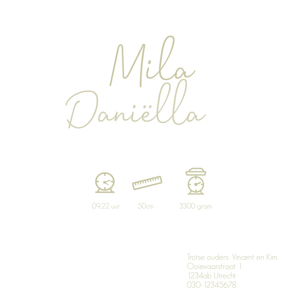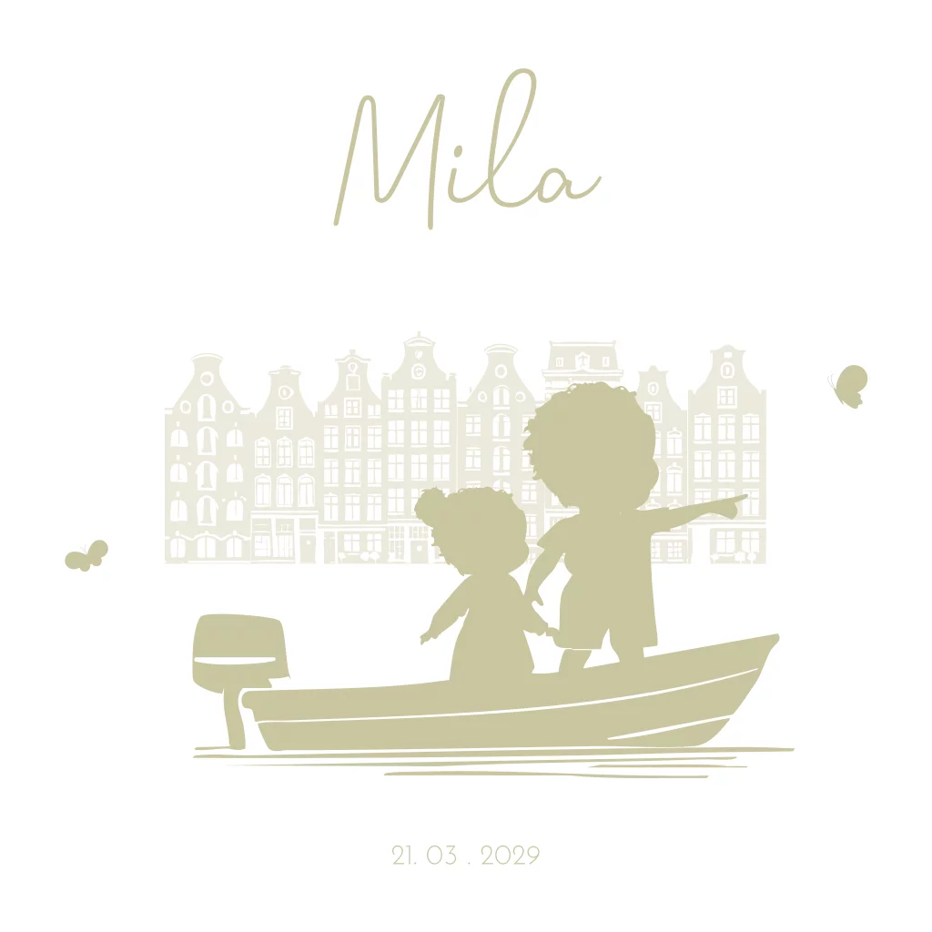 Geboortekaartje meisje op boot met broer door de grachten stad silhouet