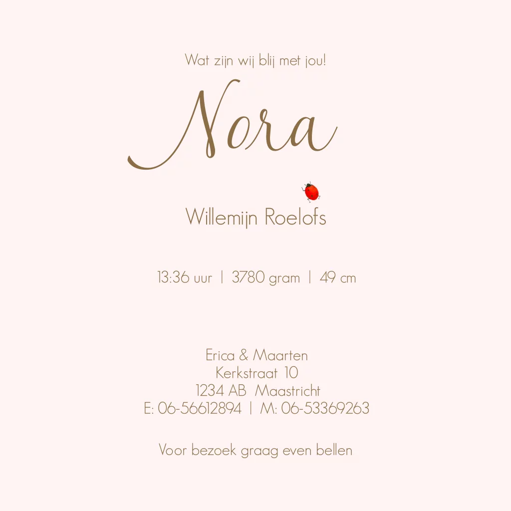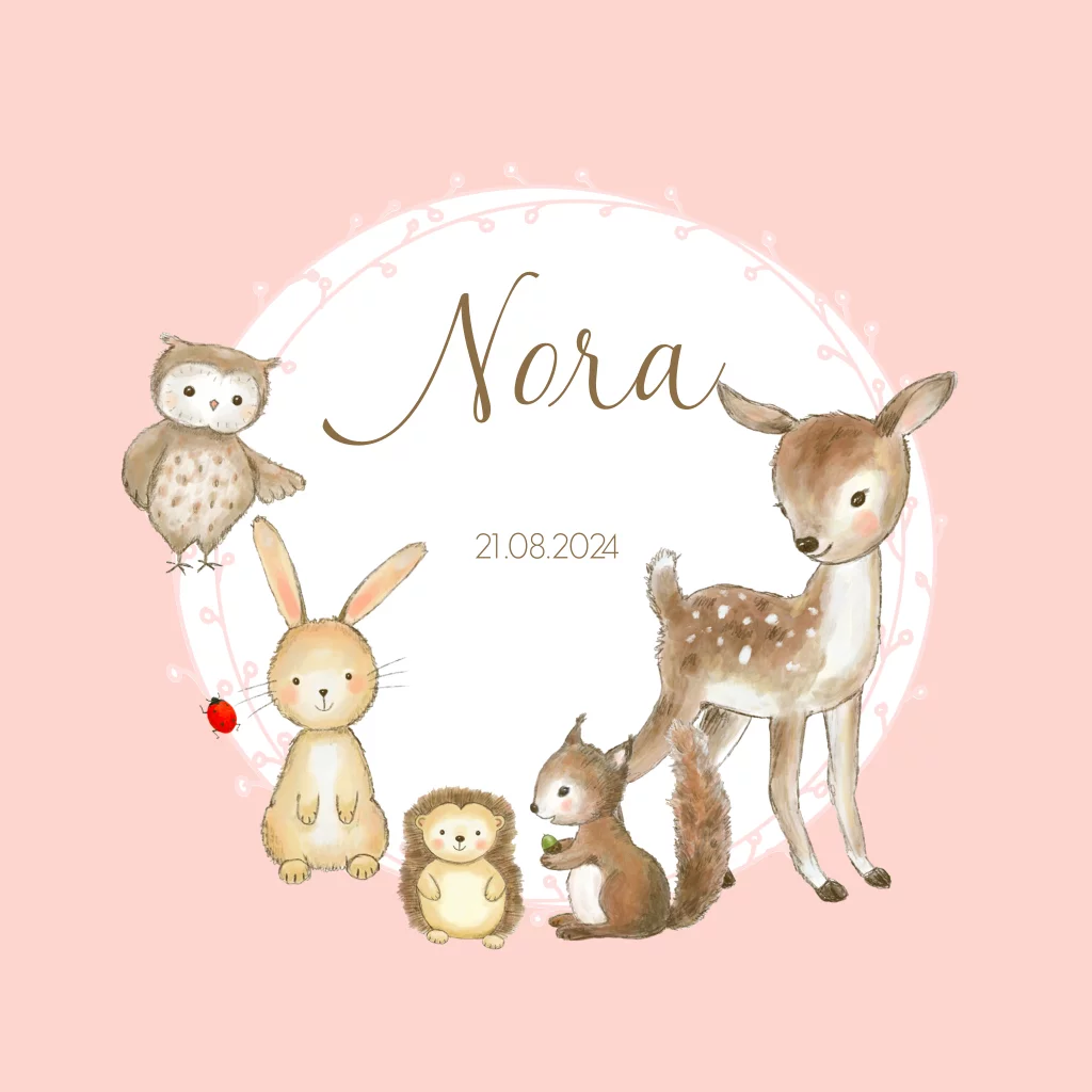 Lief geboortekaartje meisje met verschillende bosdieren op licht roze achtergrond. (3850)
