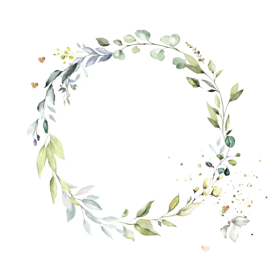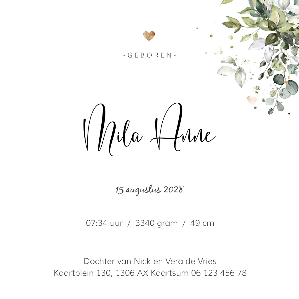 Geboortekaartje botanisch met foliedruk en krans van groene bladeren.