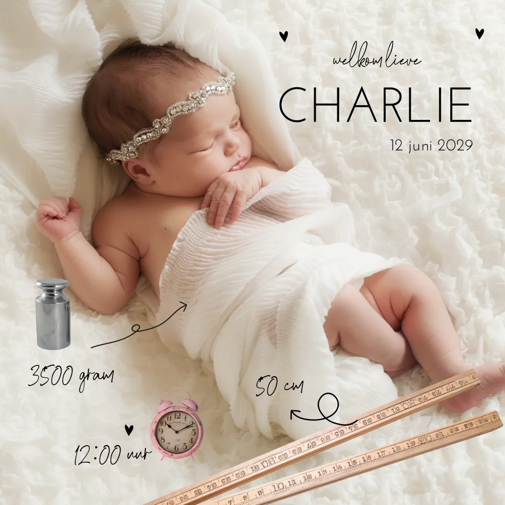 Foto geboortekaartje meisje met meetlint, klok en gewicht
