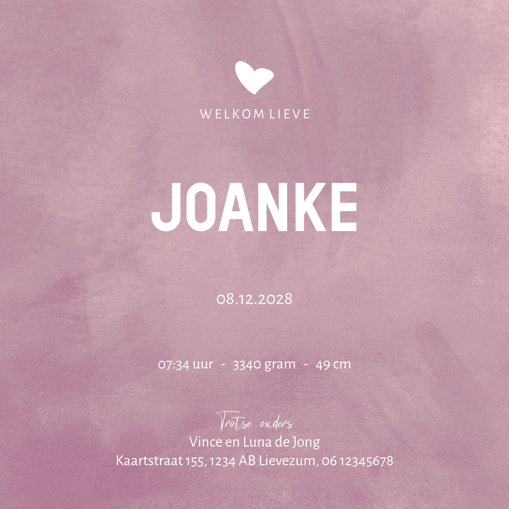 Hip geboortekaartje meisje met roze velvet look achtergrond en hartje in foliedruk. (4321)