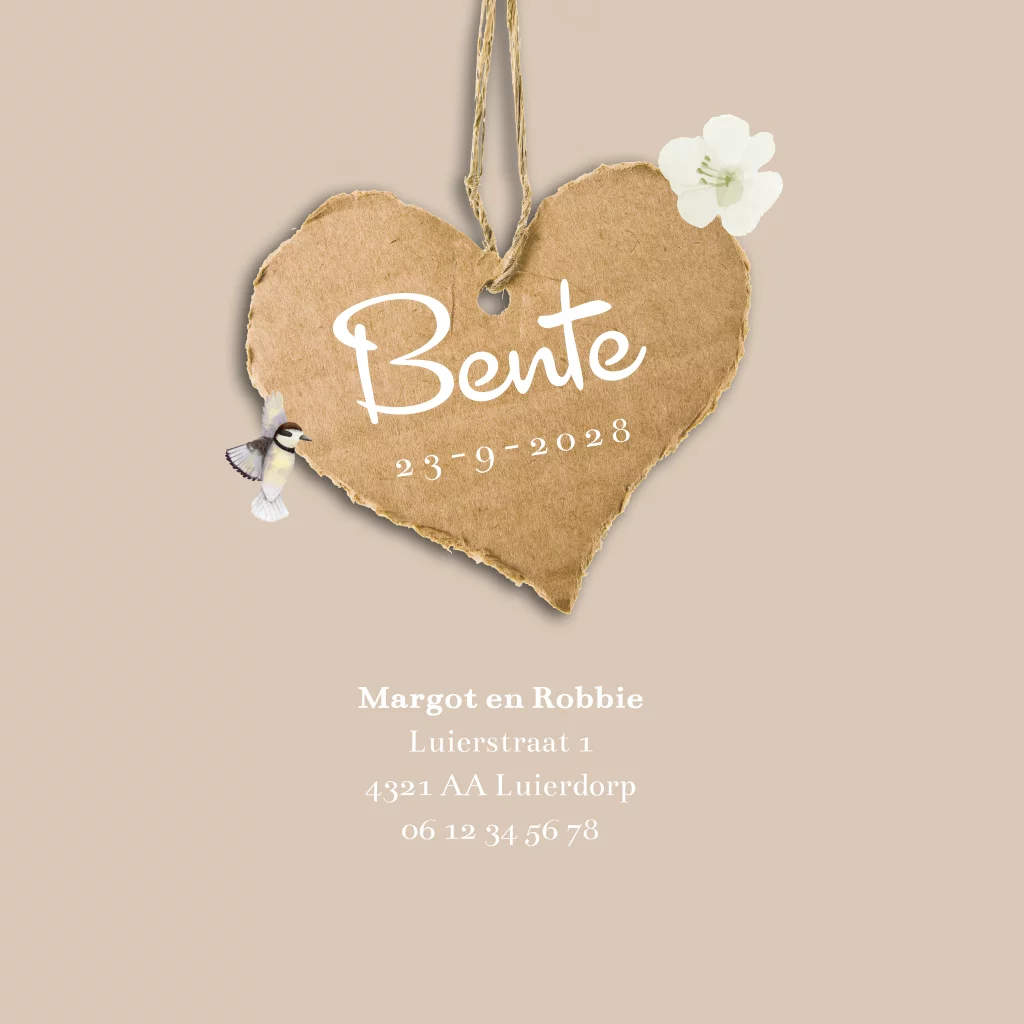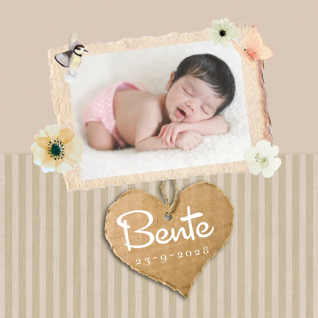 Leuke geboortekaart met vrolijke accessoires en labeltjes