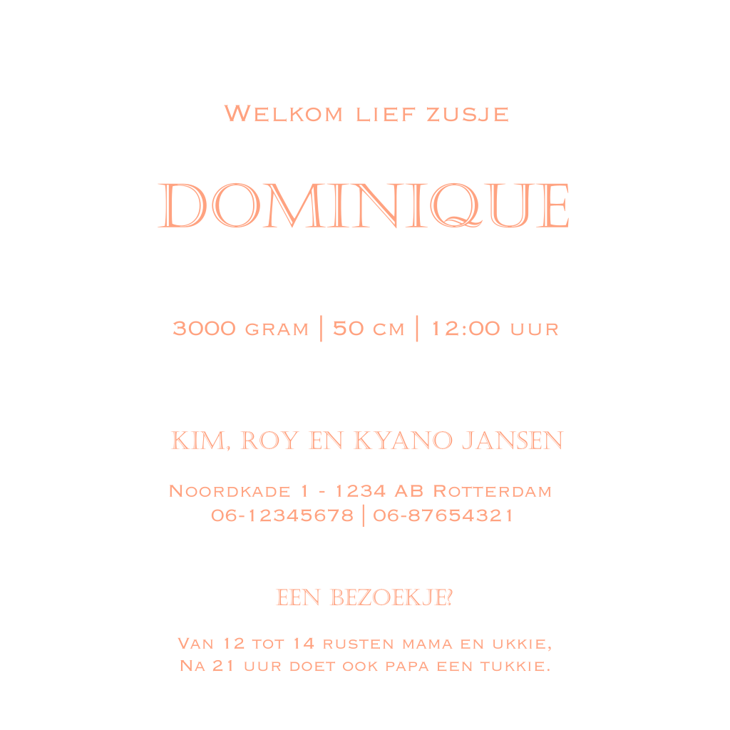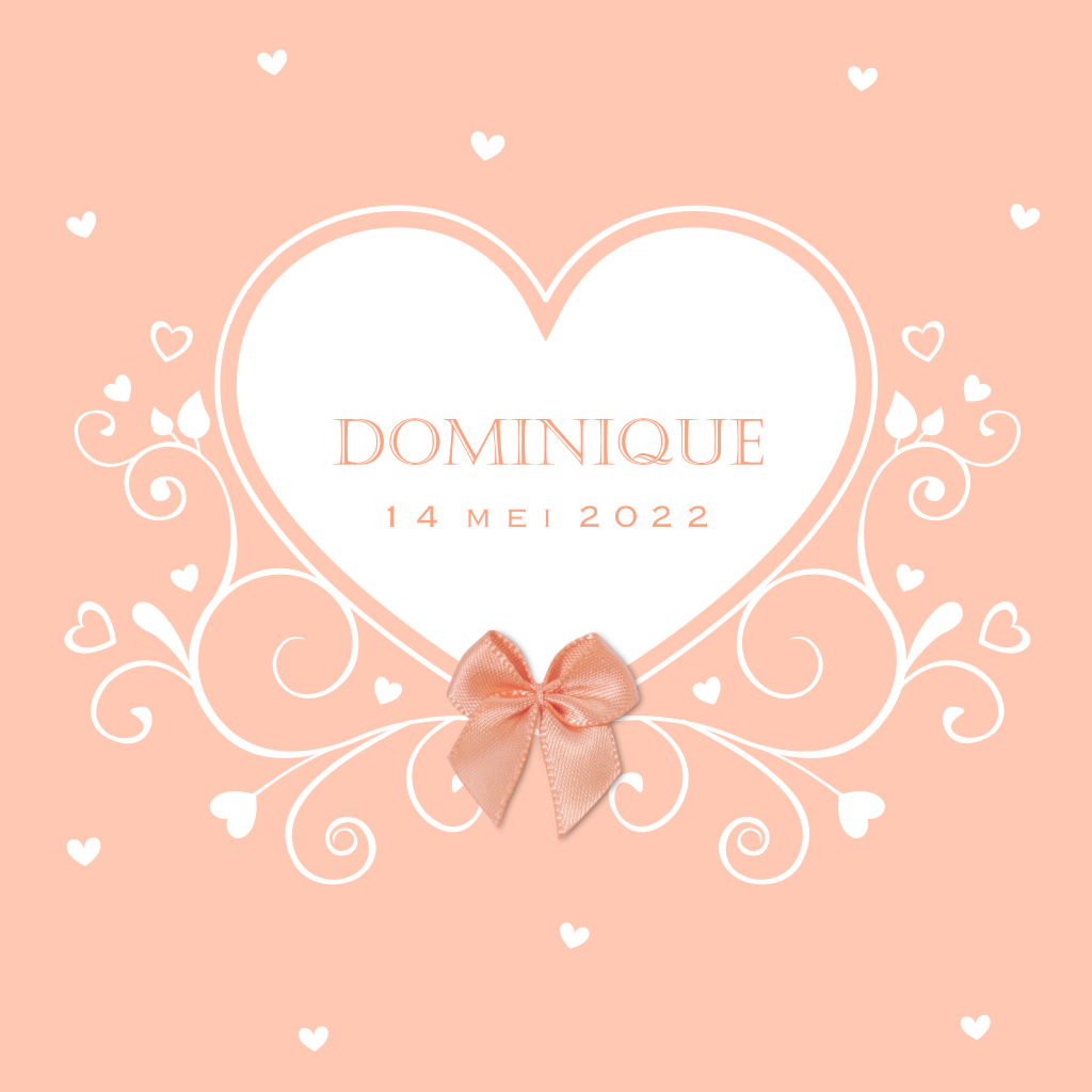 Geboortekaartje hart met strikje in roze peach. (3041) LET OP: Bij de proefdruk bestelling wordt GEEN voorbeeld strikje geleverd. Het strikje op dit kaartje wordt niet mee gedrukt, deze is ter voorbeeld. Op die plek kun je straks zelf het Γ©chte strikje plakken.