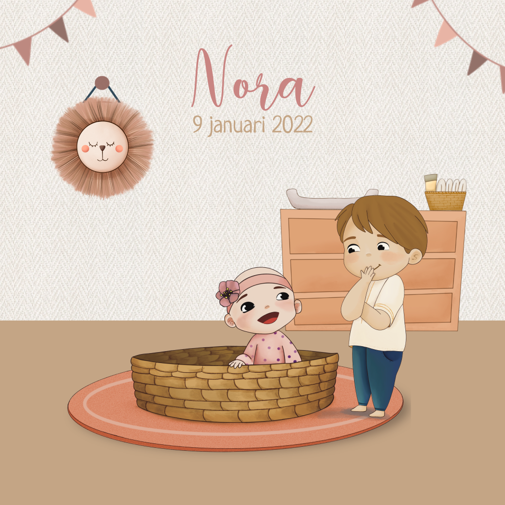 Geboortekaartje voor een meisje. Lief getekend babykamer met baby zusje in een mandje. (4300)