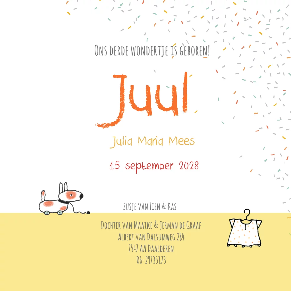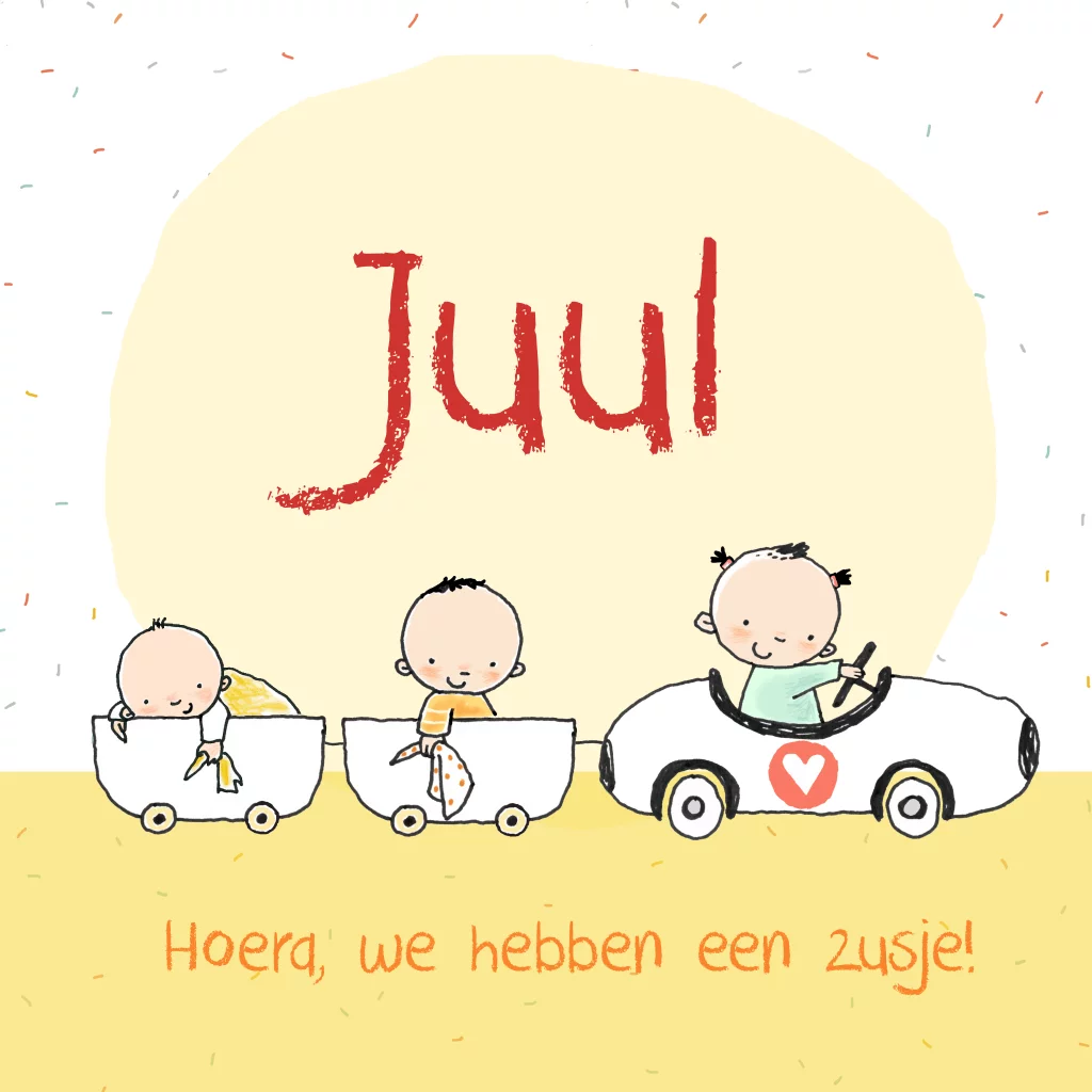 Geboortekaartje 3e kindje met grote broers in auto en karretje