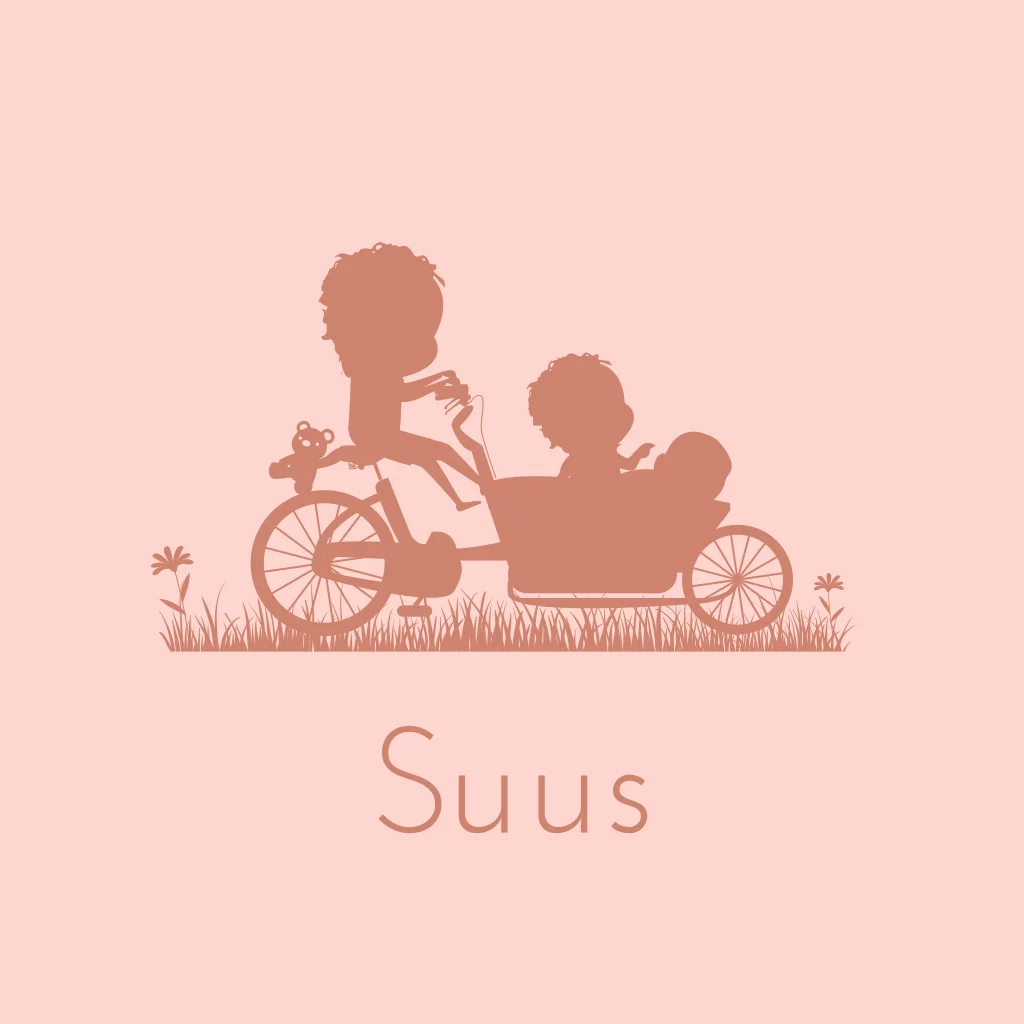 Hip geboortekaartje voor een derde kindje met een silhouet van een jongen met krullen op de bakfiets, samen met de andere grote broer broertje en hun kleine baby zusje.