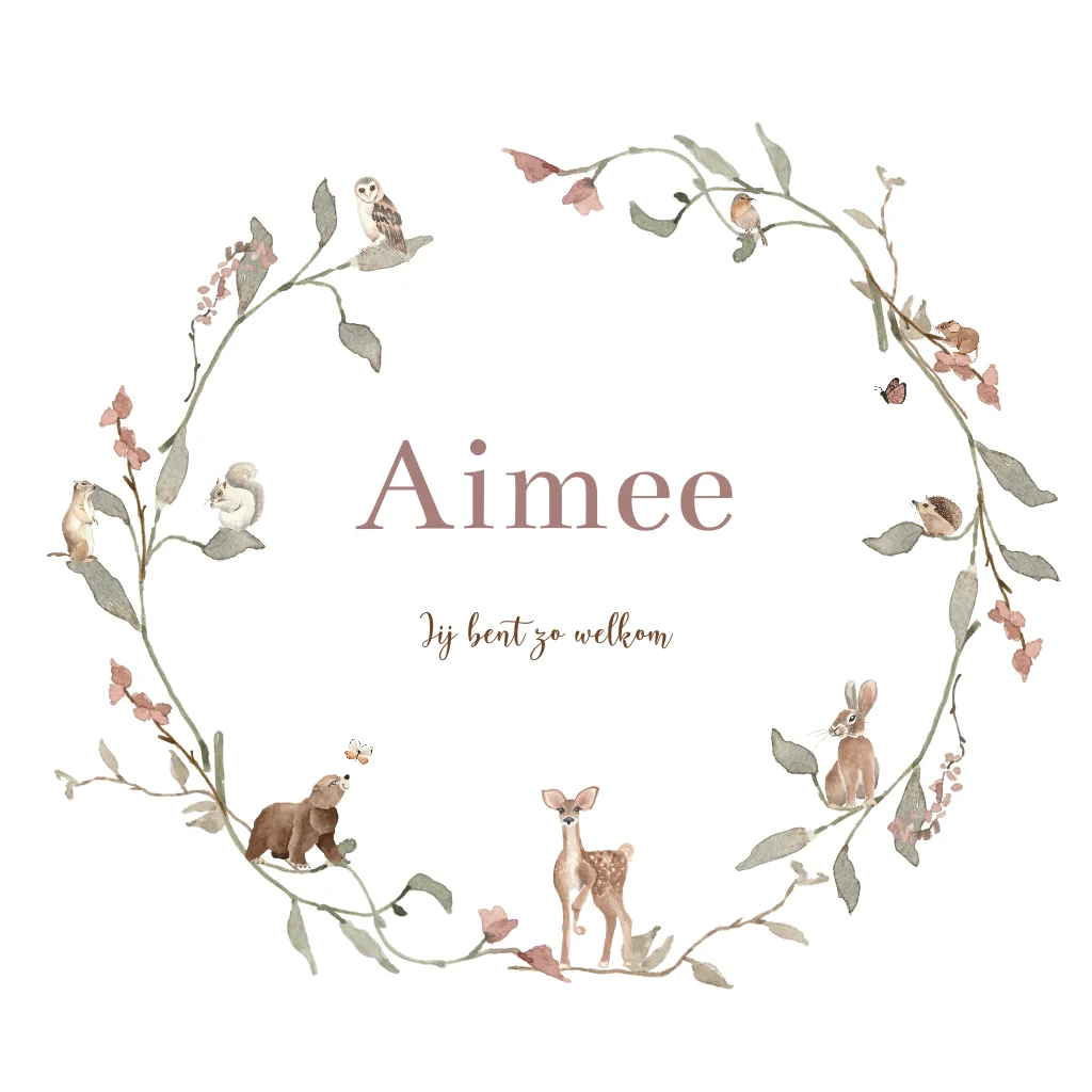 Geboortekaartje voor meisjes met lieve bosdiertjes in krans. (4269)